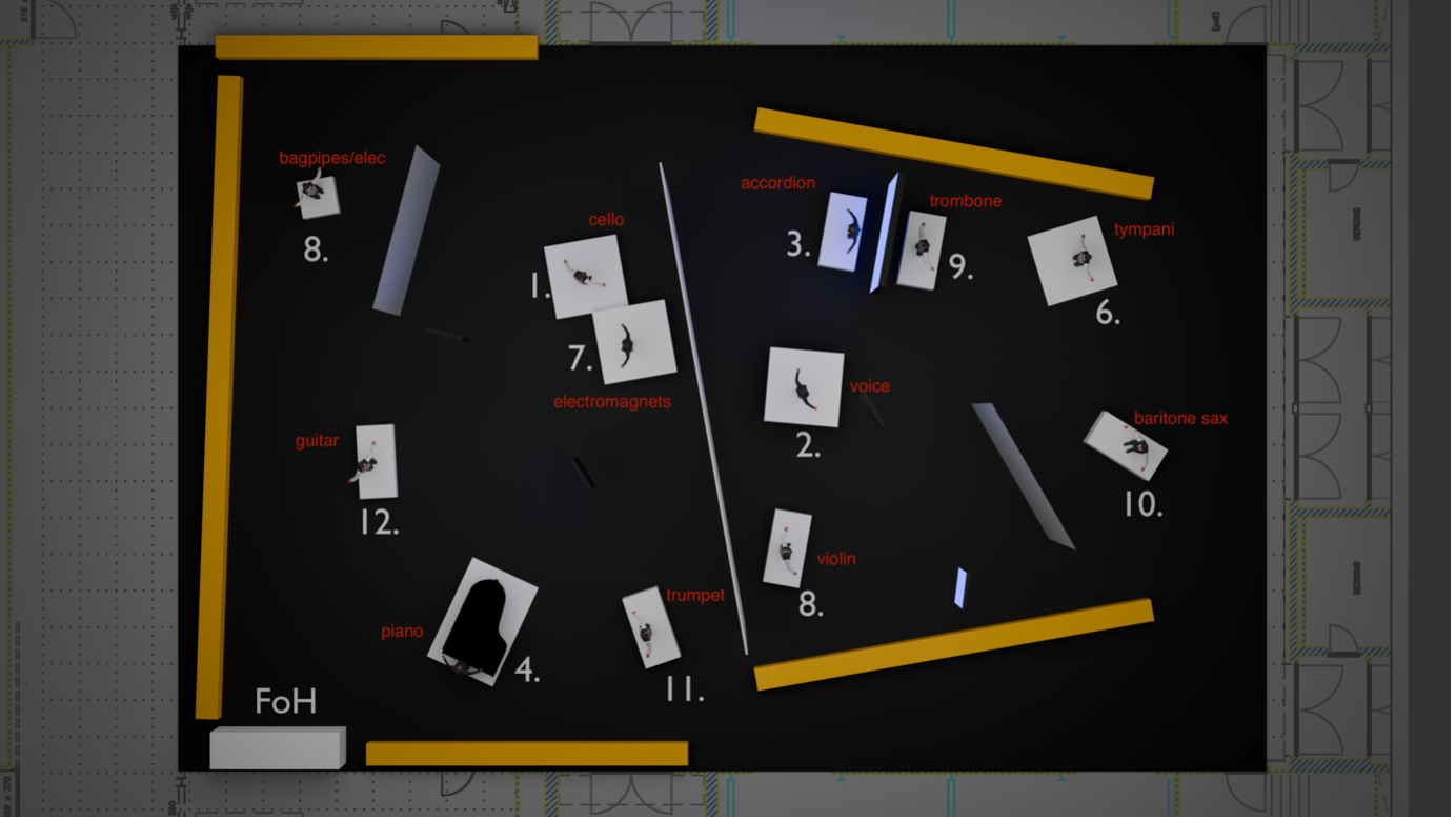 [5] The full list of collaborators on this project were: Composers (of solo pieces): Silvia Borzelli, Trevor Grahl, Claudio Jacomucci, Dmitri Kourliandski, Anna Korsun, Andy Moor, Brigitta Muntendorf, Geneviève Murphy, Mayke Nas, Aurélie Nyirabikali Lierman, Martijn Padding, Jasna Veličković. Performers: Pepe Garcia, Sebastiaan van Halsema, Claudio Jacomucci, Sebastiaan Kemner, Arthur Kerklaan, David Kweksilber, Geneviève Murphy, Andy Moor, Aurélie Nyirabikali Lierman, Pauline Post, Joseph Puglia, Jasna Veličković. The rest of the team consisted of: Darien Brito (Audio-visual art, creative coding), Theun Mosk, Cas Dekker (Scenography), Nina Kraszewska (sound), Niels Weber (Creative technology), with Asko|Schönberg, Holland Festival and Innovation:Lab as co-producers. I was credited with concept, artistic direction, composition and sound design.