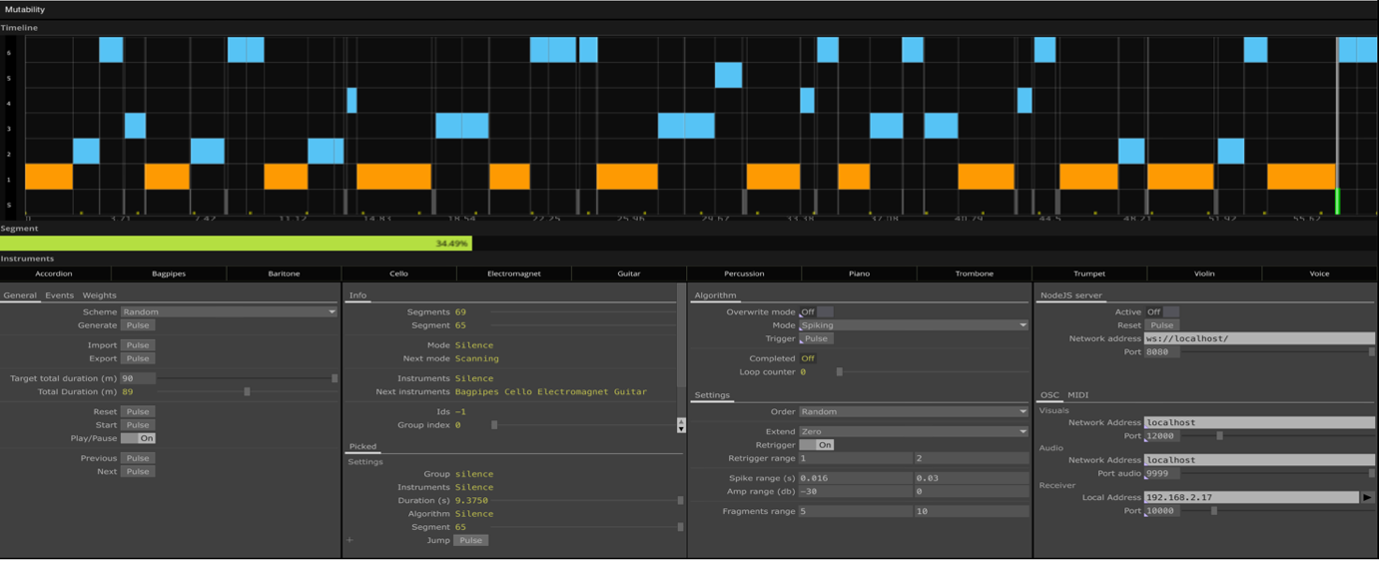 At the core of controlling the audio and visual layers of Mutability was the "master clock," designed by Darien Brito and implemented in Touch Designer. This system provided a complete overview of the activity for each 90-minute block of the performance (four blocks in total, resulting in a six-hour performance at the Holland Festival). The timeline for each show was generated in advance, offering a detailed structure. The timeline featured three distinct states of activity: