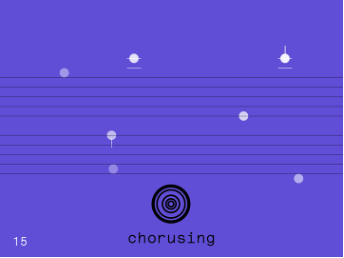 The score interface included several key elements. The name of the algorithm, a time bar tracked section timing. The instrument graphic visualized dynamic interactions between the instruments, and chorusing notes provided algorithmically generated pitches on staves for musicians to incorporate during chorusing sections.