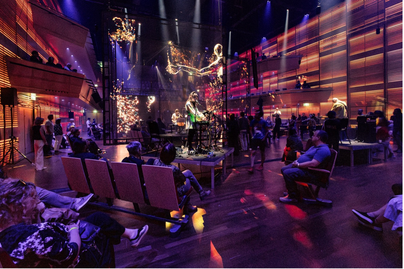 The scenographic concept by Theun Mosk/Ruimtetijd created a dynamic environment for audience interaction, emphasizing movement and multiple perspectives. The space allowed attendees to walk, sit, or stand, with a balcony offering a quieter, elevated view. Musicians performed on raised platforms facing different directions, separated yet connected to the audience, surrounded by screens that divided the room into sections. A striking 12 x 7-meter transparent Hologauze screen bisected the space, serving as the central visual divider, complemented by two smaller Hologauze screens and various LED screens and monitors, some suspended overhead for detailed imagery. This immersive design evoked a sense of exploration, resembling a playground or enchanted forest, where attendees could experience the performance from diverse vantage points.