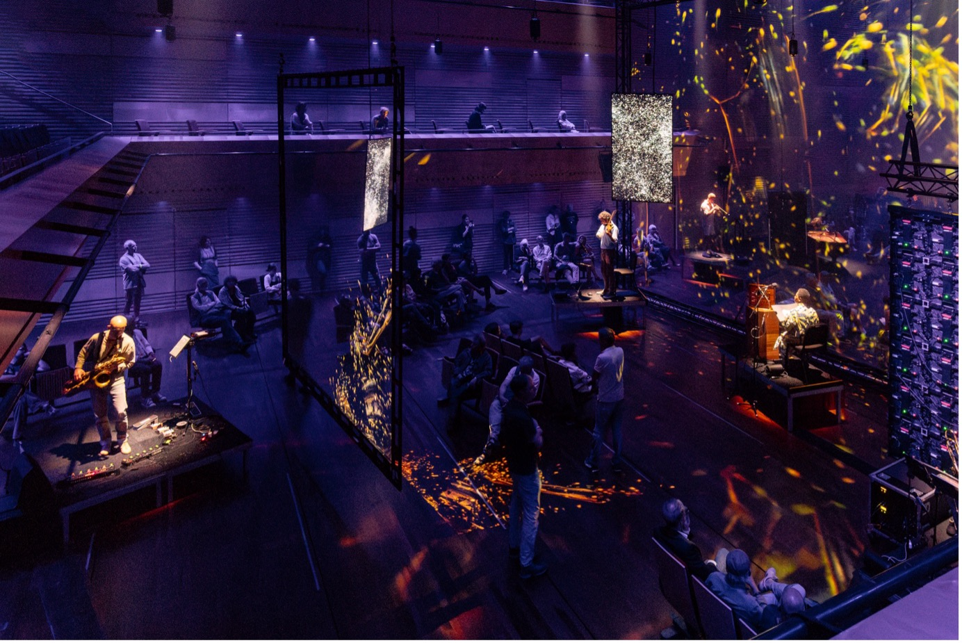 This transformation was achieved both through computer algorithms and the musicians’ live adaptation and reinterpretation of one another’s material. The 12 compositions were pre-recorded, capturing both audio and visual data, including motion capture to track the performers’ movements. This data was used to generate a "forest" of mutable visual forms and sounds that surrounded the live musicians. At various points during the performance, the musicians played their pieces—either in their original form or transformed—across different stages in the space. Detailed analysis of the compositions, combined with meticulous metadata tagging, formed the basis for creating algorithms that sorted and recombined the recorded data in countless ways. This process mirrored the approach taken in Fundaments and Variants.