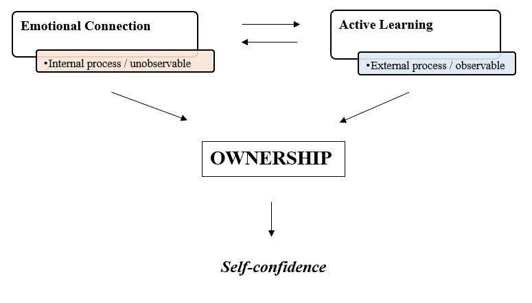 Model of Ownership. This conceptual model illustrates the relationship between emotional connection (an internal, unobservable process) and active learning (an external, observable process) as mutually reinforcing mechanisms leading to ownership. This sense of ownership subsequently contributes to the development of self-confidence.