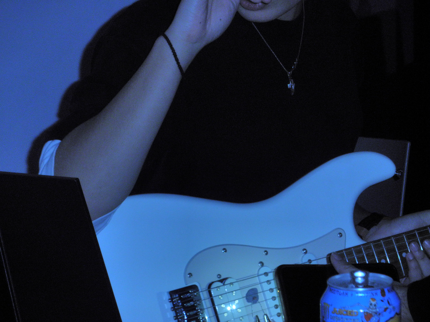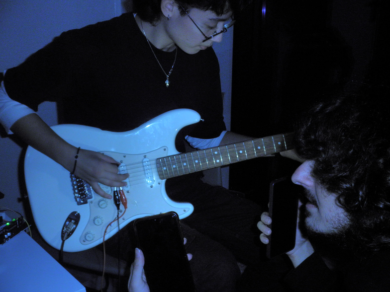 Angelina Agathaggelou, Androniki Moutaftsi, Demosthenis Papazoglou, Konstantina Sofokleous and Styliani Zintili present a performance piece that combines sound, visuals, and conceptual art to explore the idea of punk. More specifically, a guitar with a light sensor attached to it. When someone plays the guitar, the light reflecting on the sensor changes, which triggers a series of visuals we created or documented and later we coded in Processing. These visuals include images of graffiti, grunge elements, and typography with phrases like “what is punk?” and “this is not punk,” inspired by René Magritte’s This is not a pipe. The concept also draws on Dadaism, using ambiguity to question the boundaries of punk identity. Moreover the guitar sound is connected to a speaker through an amp using Bela, and a potentiometer can define and adjust the level of distortion of the guitar sound.