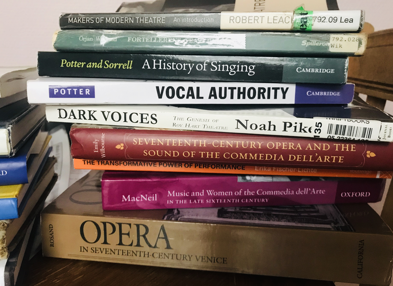 From Emily Longbourne, Nino Pirrotta, Ellen Rosand, Anne MacNeil, Nick Wilson, John Potter, et al. I've drawn theories on how Commedia dell' Arte and opera are linked, baroque opera in general, and today's early music field; Mauro Calcagno and Elisabeth Belgrano’s thoughts and theories on Nothingness; musicians and scholars like Andrew Lawrence-King and Nikolaus Harnoncourt; Susan McClary and Adriana Cavarero's feminist views on music history.