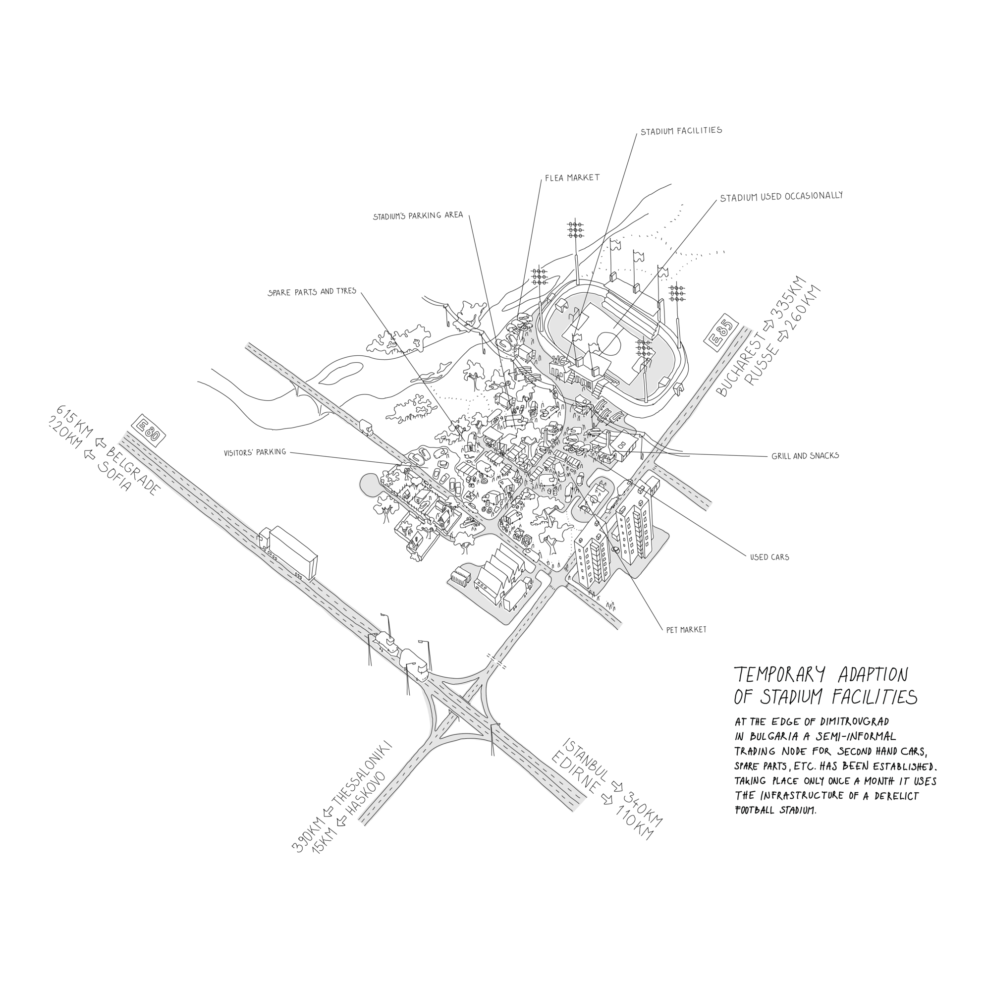 During the same trip we also visited the Dimitrovgrad second-hand car market in Bulgaria: rather naively, we had typical Western European expectations and images in mind of the previously unregulated, ‘informal’ post-socialist open-air market exotically juxtaposed with the completely ‘controlled’ space of the first and only foundation of an ideal neoclassical Stalinist-Communist new town in Bulgaria. In this town everything from the building details to the overall urban planning, landscaping, and construction of industrial infrastructure had been so accurately designed and collectivised that – accordingly to the communist doctrine – a pre-modern capitalist market fulfilling decadent petit bourgeois consumer dreams was not needed.