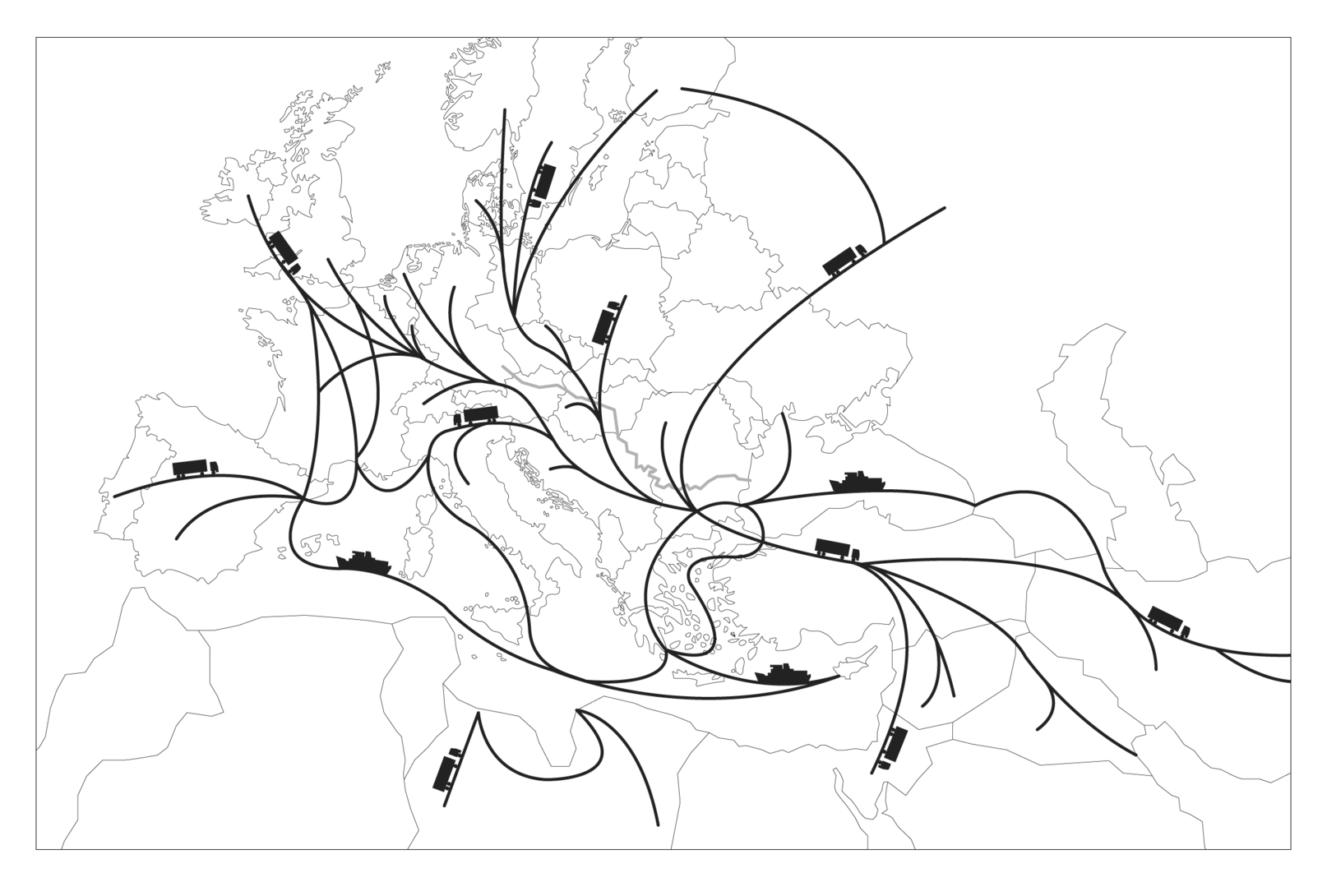 Our Bulgarian research partner, Emiliya Karaboeva, had thus far only studied the history of the state-owned company SOMAT through Bulgarian secret service archive material. For our investigation into the recent transformation of these nodes, we took the opportunity to visit as many of them as possible during our research trip: for example, at the Bulgarian-Romanian border city of Russe; in Kapikule, close to the Bulgarian-Turkish border; in Pazardjik, in the very heart of Bulgaria; and in Sofia, which is located in the very west of Bulgaria close to the border with Serbia. On these visits we learnt that after privatisation, when the majority of shares had been sold to German Willi Betz, the new owner did not have use for so many service stations. Only the stations in Russe and Sofia are partly in use by Willi Betz today. In most of the stations, spaces are rented out to a range of other logistics companies; many of the spaces are vacant and at least one was entirely up for sale, the station in Kapikule, which is now bypassed by a new highway.