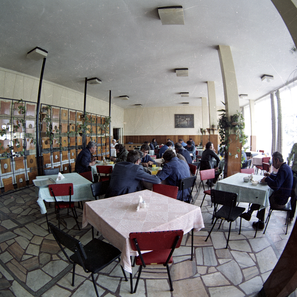 In April 2016 we set up a small exhibition in this canteen: we presented an old public-relations film about the company from 1982, which praised the competence of SOMAT’s wide-ranging network; we made a map of this network, redrawn on the back wall of the canteen; and we showed beautiful images of SOMAT service stations directly on the dining tables. We also displayed the architectural model transported from Kapikule and photos of this station’s current partly derelict and vacant status.