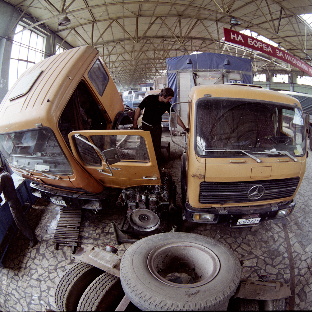 Georgi Dimitrov invited us to his onsite workspace and provided us with an overview of his own work. But moreover, he instructed us – from his point of view – about the history of the SOMAT enterprise, its current German owner, and the reasons for the decline of the company (as mentioned above in part). At the time he was the manager of Balkanstar repair and service workshop, which specialised exclusively in Mercedes Benz trucks, and in charge of a huge workshop space at the former SOMAT compound. In Communist times Balkanstar was a sub-branch of SOMAT and imported Mercedes trucks to Bulgaria in cooperation with Willi Betz, who also operated a small transport company in Germany. This collaboration is one of the reasons behind the rather paradoxical situation that a state-owned company in a relatively poor Communist state had a fleet of thousands of Mercedes Benz trucks, symbols of Western capitalist technological superiority (originally, they started with French trucks and then changed to Swedish brand Volvo). But the Bulgarian truck drivers, in turn, argued proudly that they had significantly contributed to the technical development of Mercedes trucks by test-driving them both in cold winters and hot summers in the hardest possible conditions of the Asian mountain ranges and deserts.