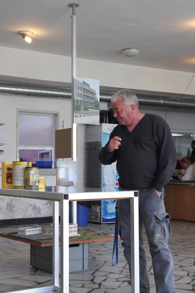 From the very start, the presentation seemed to be appreciated by the staff and regular visitors of the canteen: The canteen’s chef invited us to drink a bottle of his homemade spirit. We observed several people enjoying a look at the items smuggled by drivers back in the good old days exhibited in the vitrine, while chatting to each other with a smile. But because we lacked the needed language competence, we were not able to speak to all of them. One time we saw a man who according to his habitus, dress code, and hair obviously belonged to the higher social rank of one of the companies located at this site; we actively approached him. It turned out he spoke English very well and even a bit of German.