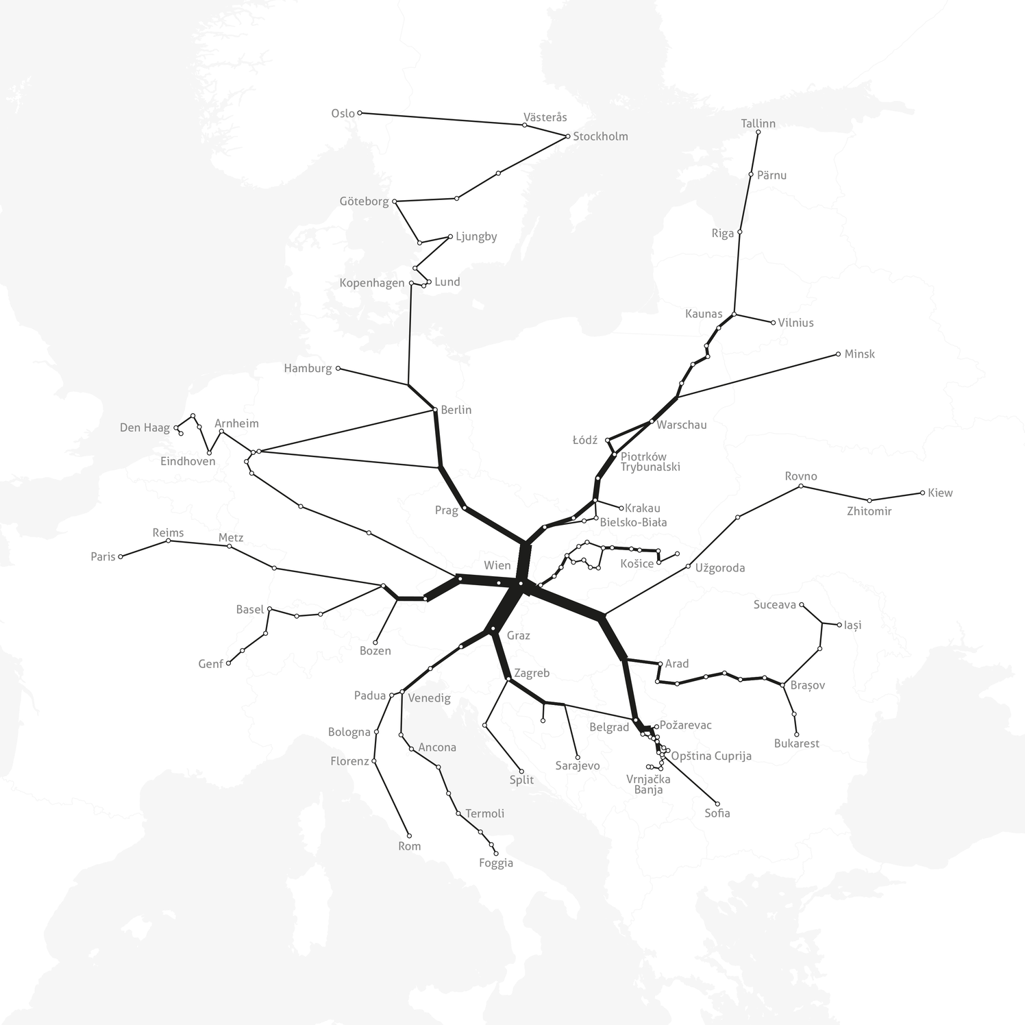 The map is redrawn from the timetable data on bus connections and estimated numbers of passengers provided by the management of the Vienna International Bus Terminal; however, there are many further smaller bus lines departing from and arriving at other, often informal bus stations.