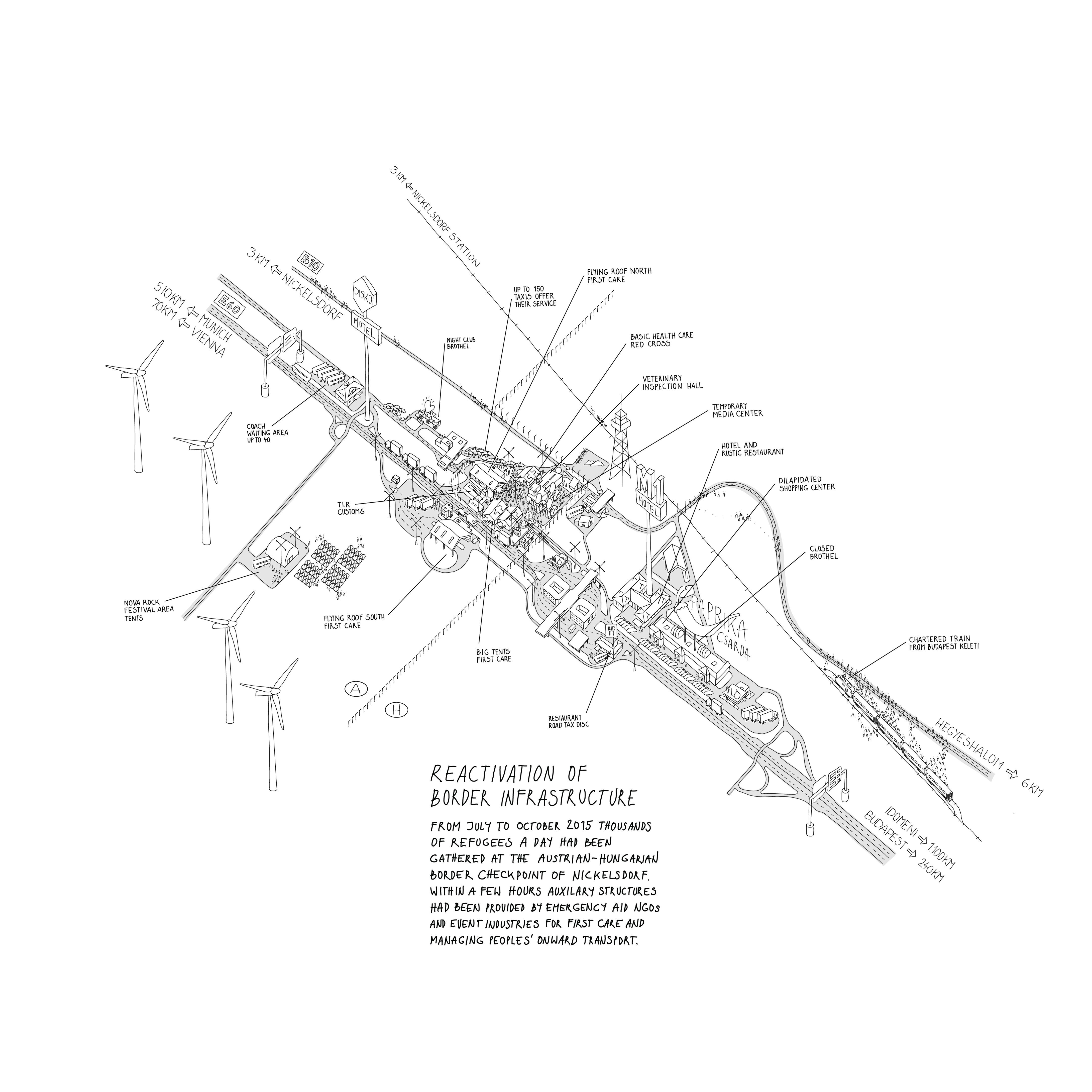 Stop and Go is a research project investigating physical and social transformation at nodes and hubs of transnational mobility and migration alongside major pan-European road corridors in a geographic triangle between Vienna, Tallinn, and the Bulgarian-Turkish border. It draws on intensive embedded field trips with a mobile lab (a Ford Transit van) using (deep) mapping, workshops, installations, and exhibitions both on tour and in a stationary work space in a Vienna logistics hub (a former railway station). Intermediate and final results have been represented in diagrammatic drawings, maps, and (animated) graphic novels.