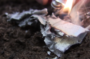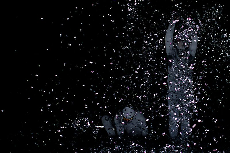 Description: On the music of shamanistic drumming, the performer would throw soil into the air in such a way that there would constantly be soil falling. The performer did throw the soil in 5 different variations, ranging in height, direction and speed, while he would turn around. The intention with which he performed the scene was rather violent. At the same time yellow and orange light would turn around his action in the opposite direction.
