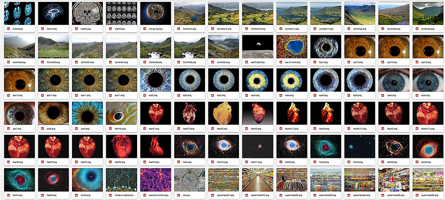Inspired by the openness of the verb-text (which allows the listener to associate) we start looking for images that have a similar open quality.. It turns out to be super difficult to find open images, because images represent something, refer to something outside of themselves. Images are suitable to adress certain themes, certain exterior things.. We have been looking for many different pictures (see on the right) but ultimately we came to the conclusion that we wanted to use more spherical ways of communicating visually. I mean no concrete images but rather abstract moods or movements. Such more abstract images we (such as brocoli from very closeby, a river-landscape from above, a seashell from closeby, and big data mappings) (see other image on the right)