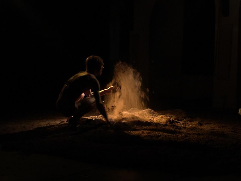 Description: On the music of shamanistic drumming, the performer would throw soil into the air in such a way that there would constantly be soil falling. The performer did throw the soil in 5 different variations, ranging in height, direction and speed, while he would turn around. The intention with which he performed the scene was rather violent. At the same time yellow and orange light would turn around his action in the opposite direction.