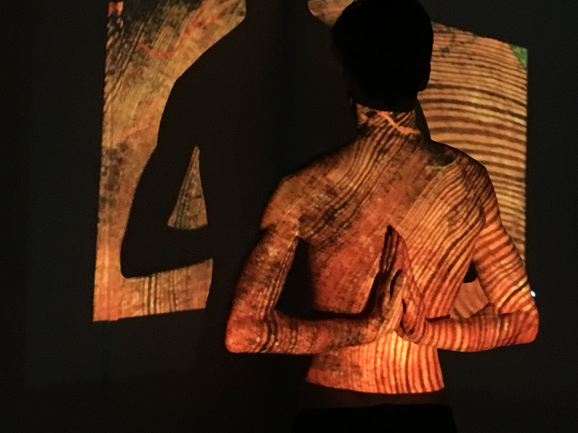 We have wanted to establish a circular motion in space by using yellow and orange lights that would turn around the performer, representing the idea of turning planets. I doubt whether anyone has noticed this circular movement. The attention may have been too much on the soil and on the performer. Also the scene might have lasted too short to actually remark the light of the turning sun. More importantly, the turning lights in the soil dance do not relate in any way to how technology is used in other scenes, which brings us back to the question that has been asked in my reflections on the breathing scene: what role does the technology play in the performance?