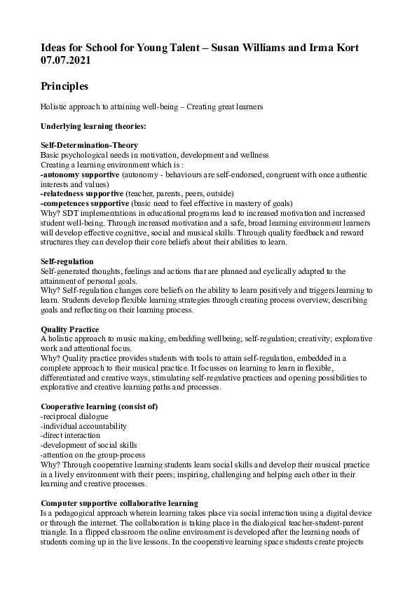 The report addressed the future of instrumental and vocal learning and teaching within the context of the YoungKC. The report included an attachment document compiled by Susan Williams and Irma Kort outlining a holistic approach to help young musicians learn how to learn in a healthy way. Underlying learning theories of this vision included the Self-determination theory, Self-regulation, Quality Practice, Cooperative learning and Computer supportive collaborative learning.