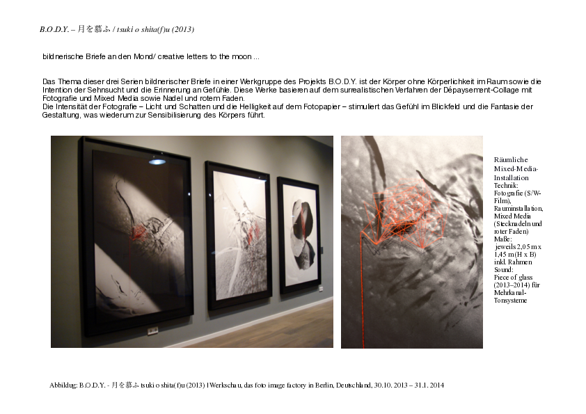 Die Rauminstallation „B.O.D.Y. -Tsuki o shita(f)u“ (2013/2024) mit den dreiteiligen Werken verfügt über vier Kanäle und einen diskreten sowie einen Stereo-Kanal „B.O.D.Y. - piece of glass" (2012-2014). Die Steuerung erfolgt über zwei Sensoren.