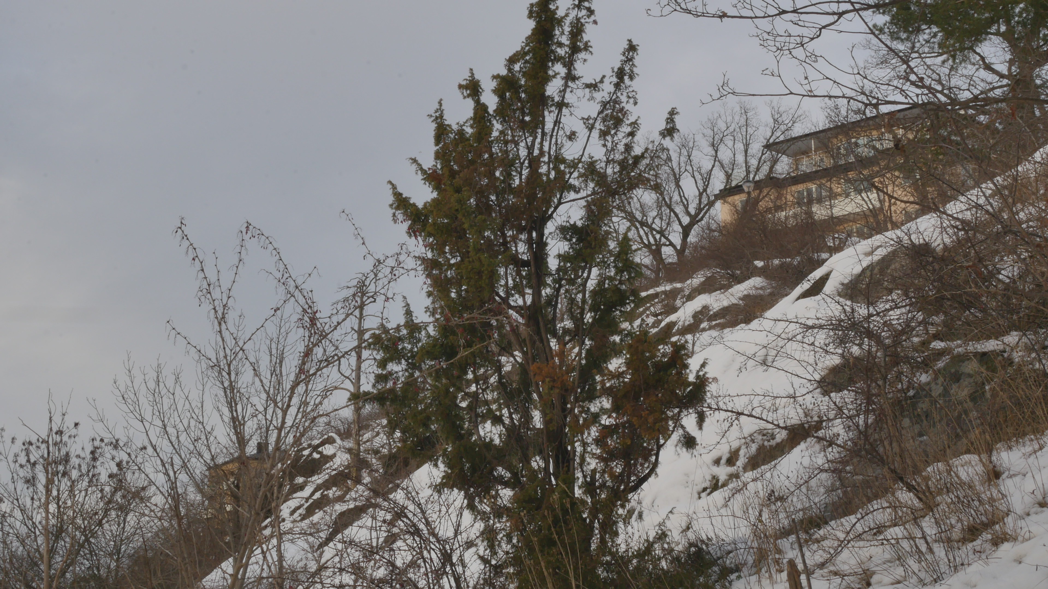 Hello to you dear one, dear Juniper. Now all the snow has disappeared so it's harder to find a good spot here next to you. With the snow, all the beautifying blankets have gone too, and I can see that you are surrounded by toilet paper, and lots and lots and lots of cigarette butts. I can't understand, it’s like someone would have emptied an ashtray here, or then they have just accumulated over the years. Now I also see that on your dry branch, because it's really only one of your branches here that is drying, you have both green and blue berries, also on the other branches. I don't remember seeing the berries before, which means that you're a kind of lady, if you like, a she. Well, not many plants distinguish between male and female individuals, but you junipers seem to do that. What is also very noticeable now that the rocks are bare is that there is a path here next to you. I don't know if it continues further down, but at least up here on this ledge it's a well-trodden path. There are usually fences here in the places where it's steep, so I don't know if it's a real path. And now that it's just you conifers that are green, one can see everything so clearly. Let's see what it'll be like when the leaves come out. You've also got rose bushes and all sorts of things that I don't know what they are right next to you on both sides. What is also very noticeable now is that Essingeleden motorway is so loud. I didn't think it would be heard this much because we are a bit away from there, but the noise is very clearly heard. But the wind doesn't come here so badly, you protect me from the wind a bit because it comes from the south-west. What I thought or planned to talk to you about is partly what is here, what you can experience, and then also perhaps what is not here, what I can experience in some way as an absence for better or worse. And today in particular, the absence of snow is very noticeable. Because we are now, it's the 5th of February, so right now there should be a lot of snow, or normally this is the time of year when there is the most snow. And often when the light is returning, the snow really sparkles and shimmers and glitters in the sunlight. There was some snow that came down yesterday or the day before yesterday, but it has disappeared again because it is above freezing so of course it is no longer there. Strange days. It will be interesting to see how dry it will be when there is no snow cover to melt. But for now, of course, it's muddy and dirty and damp. Another thing that is very clearly not here for me but which you cannot be bothered by is the news that has just spread across Stockholm and throughout Sweden that there has been a horrific school shooting in Örebro. And it used to be the case that the school shootings that I know of were in Finland, a few years ago. And Sweden had its gang violence and all the bombings nowadays and so on. But this was a huge school shooting at an adult school. And the shooter was 35 years old and apparently shot himself as well. It's always eerie with these acts of violence that are like lonely, unfortunate perpetrators, because one thinks there should have been a chance of finding that unfortunate person before things got so bad. One doesn't want to get involved in other people's problems and in society nowadays we are less and less dependent on the family in any way. Although I personally am very dependent on the family because I don't have a family of my own, i.e. not a husband and no children. In a way, you grow up here quite alone on the rock. There is no relative near you, but I can see one, let's say maybe 50 metres from here a little higher up. There is a juniper growing there and there are a few more, further up on the Fredhällsklippan cliffs. But that's not a community you have here if I think of other places where junipers often grow in large clusters. But as it is there may not be enough food for so many here on this little ledge. And what I said about the path, it actually seems to be a path, because now there is a person walking down there on the path. It will be interesting to see if she finds her way or if she simply turns round. Yes, she seems to do that. But as a method to think about what is here and what is not here is quite good, because there are so many things that are not here, and that one can be glad that they are not here. Not just the school shooting, but the wars going on in Ukraine and the Gaza Strip and the West Bank and the Middle East in general and in many other places too. And now some kind of machine that almost sounds like a weapon is clattering, but it reassures me to know that it's really, it's construction work. And now I see the woman who was walking along the path, she really continues forward but now she crawls on all fours a little further on to get to the path on the other side of the cliff. Tough enough, I wouldn't try it probably. But luckily, it's not that slippery right now because it's not frozen. Other things that are not here right now are of course bugs and mosquitoes and things that could bother you. But I think the thing that has bothered you most here is the people who have come and dumped all this poison at your roots. One can only hope that there is not so much nicotine left, but that it is mostly only those filters that will not decompose for hundreds of years. But nicotine is a pretty nasty poison for plants too. I wonder why one of your branches here has started to yellow, whether it has been damaged in some way or whether there is something else causing that particular branch to dry out. But I can't see that from the outside. So other things that are not here – yes, and she managed it, I don't see her any more so she must have made it up to the path, it was tough – but what is not here, apart from not very many other people, there is no famine, for example, or not to any great extent in any case, and there is no plague now. And the strange thing is that although I have