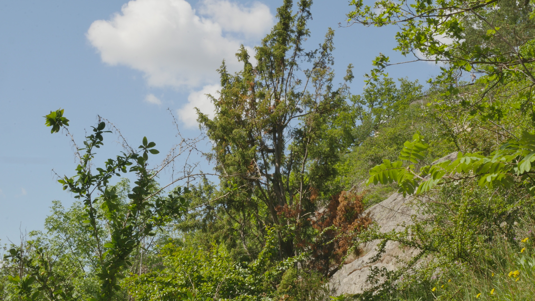 Hello to you dear Juniper. I'm almost shocked because now this branch that used to be a bit yellowed and dried, now it's starting to dry completely and it's becoming obvious that it's probably dying. But all the other branches look fine. I must stay here behind you, because there is quite a strong wind, from the west, south-west, so I hope you will protect me a little. Right now, the sun went in a big grey cloud even though it has been sunny. In fact, there was a shower this morning, or a couple even, but it's not very visible here in the landscape. Maybe it was a small shower. I even thought about postponing my visit to you until tomorrow, but I decided to come today anyway when the sun came out. It's the second of May so it's really spring now, and your surroundings have changed because many of the bare branches on different kinds of bushes have now started to get leaves. Nearby there are some dead branches, but that's probably, it's a kind of hawthorn, I see, some of the branches are alive. But on the other hand, this shrub behind you, it's familiar from Finland too, but I don't remember what it's called either in Finnish or in Swedish. But it is quite common. And I think that this one has such red doughy berries, if it’s the one I'm thinking of. And then there's a bigger one on the other side of you that has already big leaves. I don't know if it's the same plant, but it could also be something wild cherry or plum-like. No, not cherry because it has flower buds now, but I was thinking of some shrubs that are related to plums. Well, it will flower later but further down the bank there is already something that looks like a bird cherry already flowering, or it is something else but white. No, it can't be a bird cherry with so few leaves. I must look when I leave here because it's almost a tree, an upright tree that grows right by the water and has beautiful flowers. And then there are little red spring flowers here or violet. They are, I don't know the name of them either, but they're not hepaticas but pea plants. And then a lot of blue beer baskets [beer cans] right by your roots, really a big collection. So not so much new tobacco butts but beer baskets [beer cans]. Well, it was May Day Eve yesterday. But here it is not celebrated in the same way as a carnival like in Helsinki. I hope you are well. Now that everything is greening up around you and especially with this dead branch or dying branch, you look a little more pathetic. In the winter, you looked so green and cosy, as they say, but now you are the one who is fading, unfortunately. But I imagine that for you spring also means buds and new energy, more light, more work. Well, I'm reading a book, I've almost finished it, called Diversity of Life by Edward O. Wilson. And it's a real classic about biodiversity and in some parts it sounds so incredibly optimistic that I started to wonder when it was actually written, when, in what year. And then I realised, I discovered that the first edition came out in 1992, so 30 years, more than 30 years ago. So, no wonder things have got worse, we are not as optimistic anymore. He is very optimistic that we will find ways to make it somehow economically feasible to preserve large ecosystems so that they can be economically viable for the people who live there without having to be wiped out, because species richness is a kind of capital where there may be unexpected, untapped opportunities for medicines and different kinds of genes that can point to resilience and so on, the whole issue of why it is so important to have biodiversity as a kind of safety capital for the plants that we grow. But a lot has changed since the early nineties as the biomass is mainly our livestock, or not the livestock but the factory animals, the ones we eat, chickens and pigs and cows. And then of course maize and rice and soya and wheat that we grow. In a way, here on this steep cliff below Fredhäll, this is called Fredhällsklippan, the Fredhäll cliff, but the suburb above, an old suburb so it's quite close to the city centre, is called Fredhäll. So, this steep cliff is, in a way, an example of how few places there are left, where there is a possibility for different types of creatures to live a life that is even to some extent wild. In other words, where there could be some sort of unexpected biodiversity that is not entirely dependent on humans. And that's significant in a way, because it's the same with the whole planet, that it's like in small, somehow inhospitable, steep, or inaccessible or kind of non-fertile little outposts where life can overwinter, so to speak. But he has the idea that we should try to somehow preserve a larger part of the species composition so that we can cope with the bottleneck that the growing humanity, or the growth of humanity, represents. That is, with the hope that when we have reached some kind of climax, humanity will start to diminish and adapt to the surrounding resources. But there's a long way to go yet. So right now, there's not much room for you, dear juniper and all the others. It's somehow, as a juniper, you're a pretty good example because we don't plant junipers in the parks. I've found a lot of cypress trees that look very similar and they're your relatives but they're not wild junipers, because junipers are things that sort of grow wild and can sometimes benefit from humans when we cut down everything else or when animals eat everything else and so on. But it's not something that we plant, even though humans have learnt to use juniper berries and juniper branches also, and there are some cultures that use juniper as medicine and so on. And then you have a nice wood that you can make into spoons and knives and everything. But you are not a new, unexplored species with unexpected properties that you can find in the tropics. Or all the insects that we know so little about and so on. Well, biodiversity, in a way, when I look around here, I think there are so many di