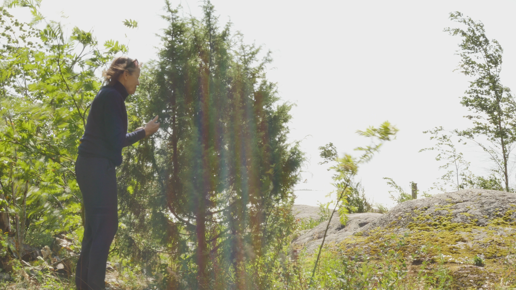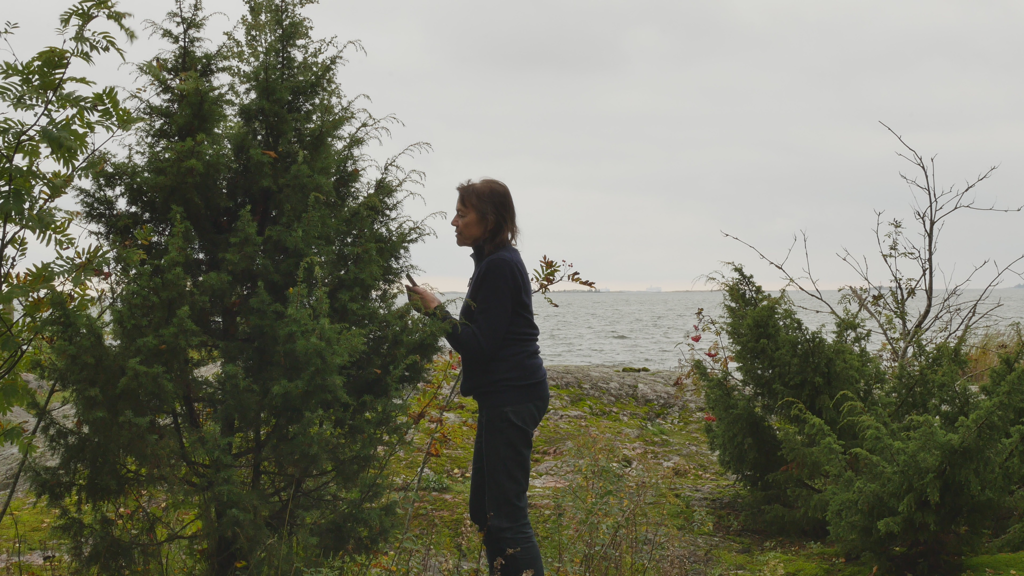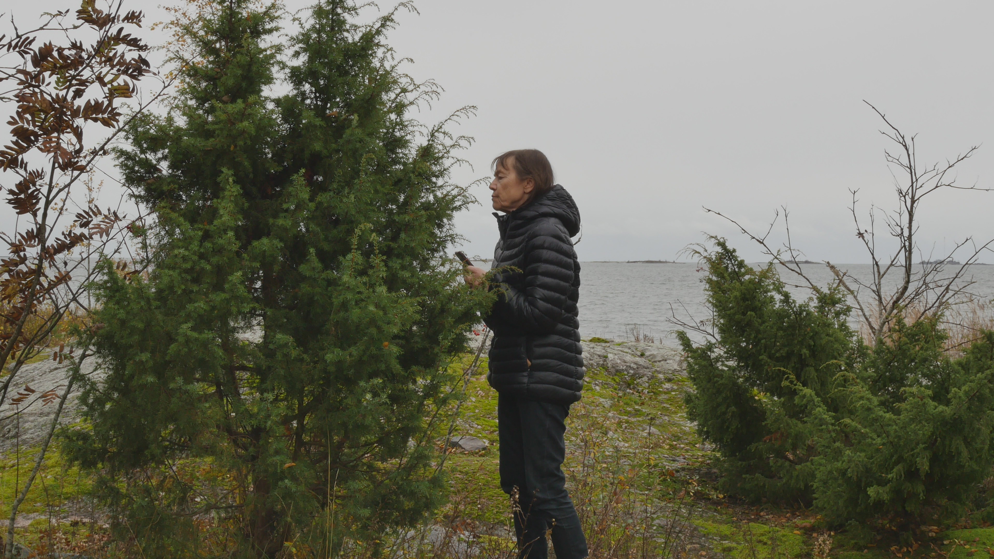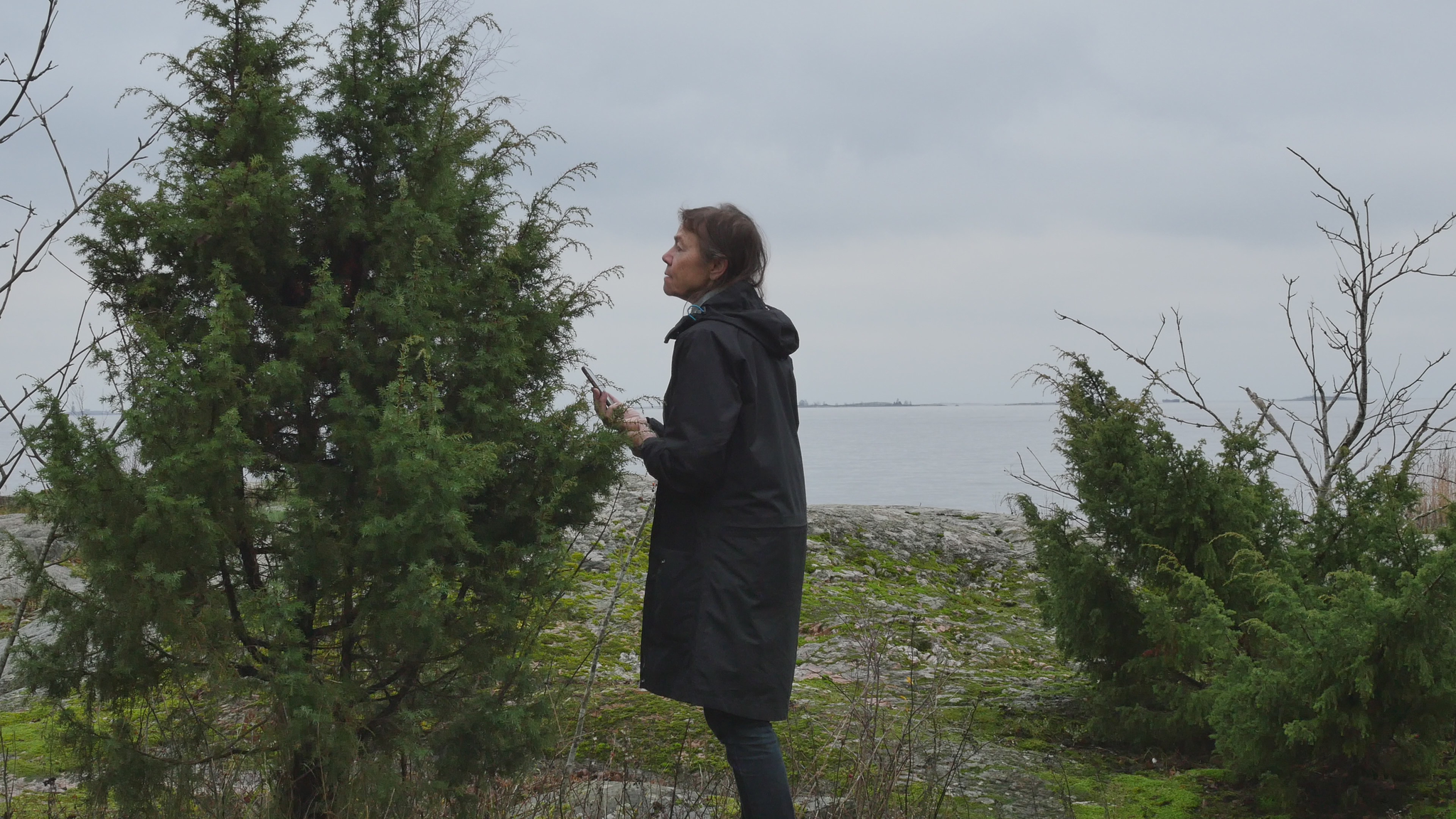 Hello juniper, nice to see you this November Saturday. The weather is really strange because it's completely calm. Now there is a motorboat passing but otherwise it's really silent, too. There were couples walking on the cliffs, after all it is Saturday, and I could even hear their laughs but now at least one of the couples went away. I actually planned to go to Harakka island today because now when the ferry boat is no longer running it's not so easy to get there and one option is to row with the small rowing boat Korento, but I don't like growing alone so I asked my colleagues if any of them would, or the two of them that we share the boat with, if they would like to go today and they didn't, so I decided I would come to you. But now when I'm here and I look at the sea, which is so calm and still, I realise I could very well have rowed to the island on my own as well. But I'm here now, so good to see you and as always you look sort of extraordinary fresh compared to all the dying or dead looking deciduous trees around, like the birch. Of course, I know they're not dead, but they look dead compared to you. And the name of the month of November, marraskuu in Finnish, marras, it actually means, it is old Finnish so I wouldn’t know, I had to check this, the word means dead or in the process of dying, about to die. And of course, this is the time of year when well, nature is sort of dying or going to sleep for the winter. But not you, you as you and not as in yew the relative of yours the yew tree, I don't know if I pronounce it correctly, but I was reading about the yew tree on the ferry when I came here in a book called Elderflora: A Modern History of Ancient Trees by Jared Farmer, which I finally received. I heard a talk by him earlier and was fascinated by his ideas and now I'm reading the book, which is very entertainingly written. I know you are not of the same family as the Yews but still there is some resemblance because they’re conifers, too. They are poisonous and then they were very much in need in mediaeval times, which I didn't know, not for the poison but because their wood was so good for creating bows. So, when at the time when the armies were fighting with bows and arrows yew trees where sort of cut down almost to extinction in Europe. But what I plan to talk to you about was not about yew trees of course but about technique, identity, and place. And that's because I listened to a lecture or talk by Ben Spatz, like a demonstration lecture for doctoral candidates actually, online, and he has written a book called, let me see, Race and Forms of Knowledge: Technique, Identity and Place in Artistic Research. I haven't read the book, but he had an exercise based on his ideas in that book for the doctoral candidates and I thought that was fascinating. First of all, to choose an image of one’s practise and then to look at that image and try to analyse in which ways you could say something about technique, or about identity or about place from that image. Or what those, what that image would sort of reveal of your practise in those respects, which are of course entangled very much, which he explained briefly. And if I then, I made the exercise or began making the exercise with an image that I happened to have on my computer, but if we now think of our practise here and the image that is produced of our conversation on video, so in the same way as with the image I chose I think technique is very easy to find on several levels and place is also very obvious, you could say on several levels, but at least on this physical level. But identity is so much more difficult. And of course, then I immediately feel ashamed, because that's what sort of middle-class white people always say. They consider themselves as unmarked, that their identity is somehow unimportant, because they don't suffer so much from discrimination, they're privileged, on the contrary. But of course, I mean related to knowledge. And I always feel like I don't have an identity that would have a special knowledge, because I'm not racialized, or I don't have a disability except age of course. But then my first idea was of course that there are some things that I know from experience because I'm a woman, and an unmarried, childless woman at that, a spinster actually, so there are some forms of knowledge that I know from experience that other people wouldn't know. And then when I thought about it a little bit, there is also the idea of language, identity in terms of language, because I'm a Finnish Swede and also a Finn through my mother so I have this dual identity, these two languages. And being a Finnish Swede is a minority and for many people it's very important. It hasn't been so important for me because I've sort of fluently switched between those two identities. But if I think about it so the reason that I speak English with you is exactly because language has a meaning. Language is not one and self-evident. So, I speak Swedish with a yew in Stockholm, not yew, sorry. Now I'm all about yews because I've been reading about yews, I call you a yew. You are not a yew, you are a juniper, excuse me for that. So, dear juniper, I speak Swedish with a juniper in Stockholm and I speak Finnish with a juniper on Harakka island. And then now I speak English with you because language matters. And maybe it wouldn't matter in the same way if I wouldn't be bilingual to begin with. So, actually there are some aspects of identity that make a difference for our conversation as well. And yes, I know, language makes a difference because I don't speak ‘juniperish’, I don't, I cannot deliberately use volatile chemicals to respond to your volatile chemicals for instance. But of course, then when I said technique is so easy, with that I mean there is like technological technique involved here because there is this phone in my hand, which serves as the microphone. And then there is the video camera on tripod nearby, which records our im