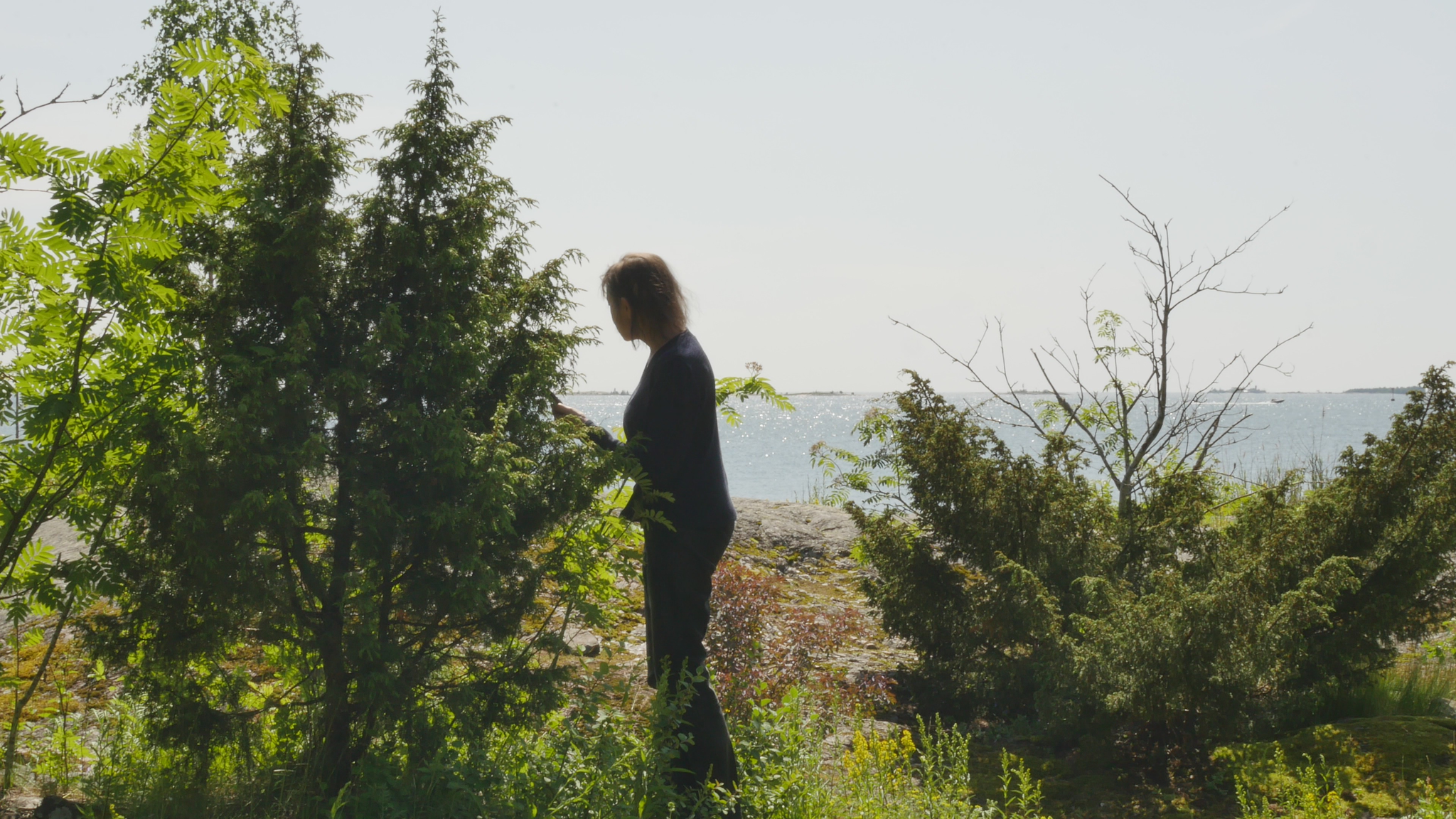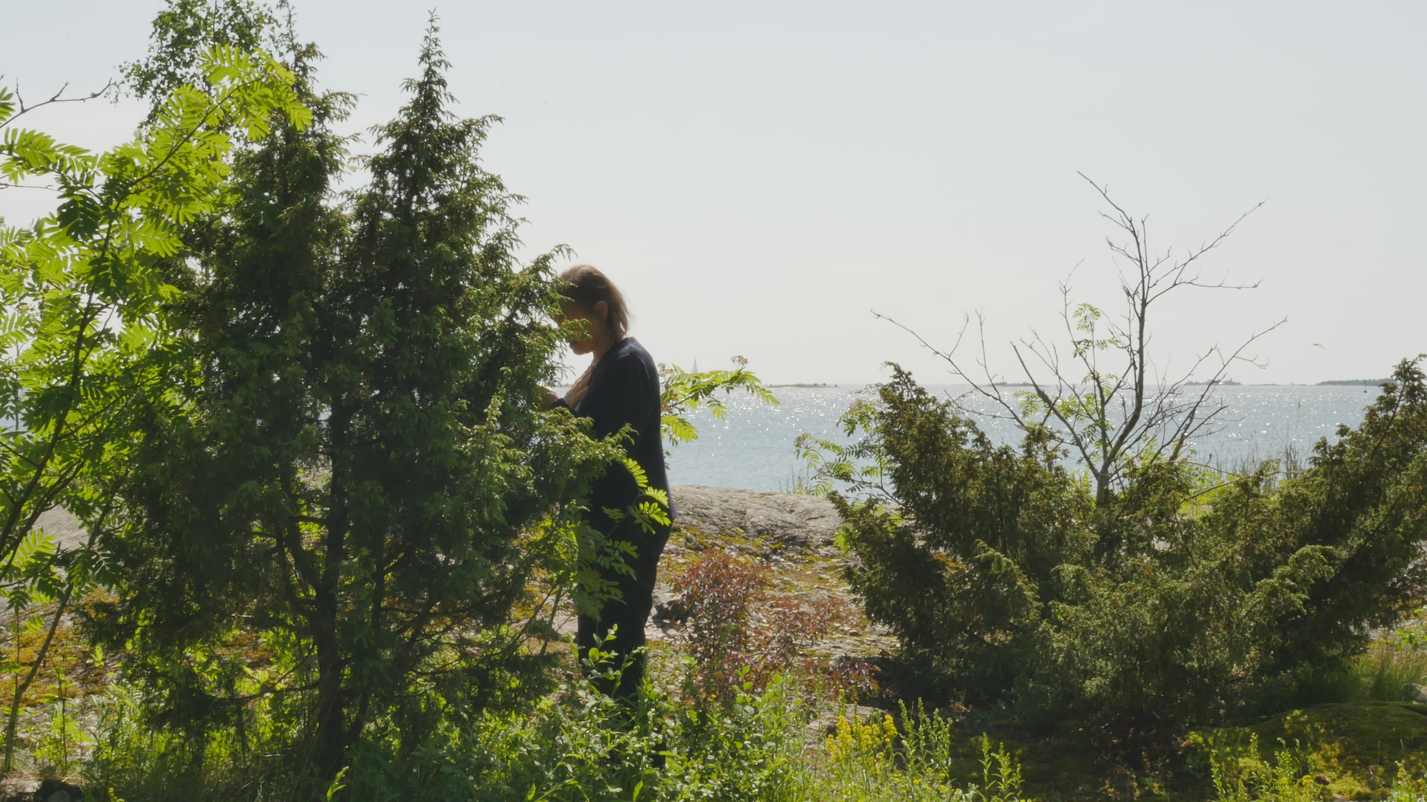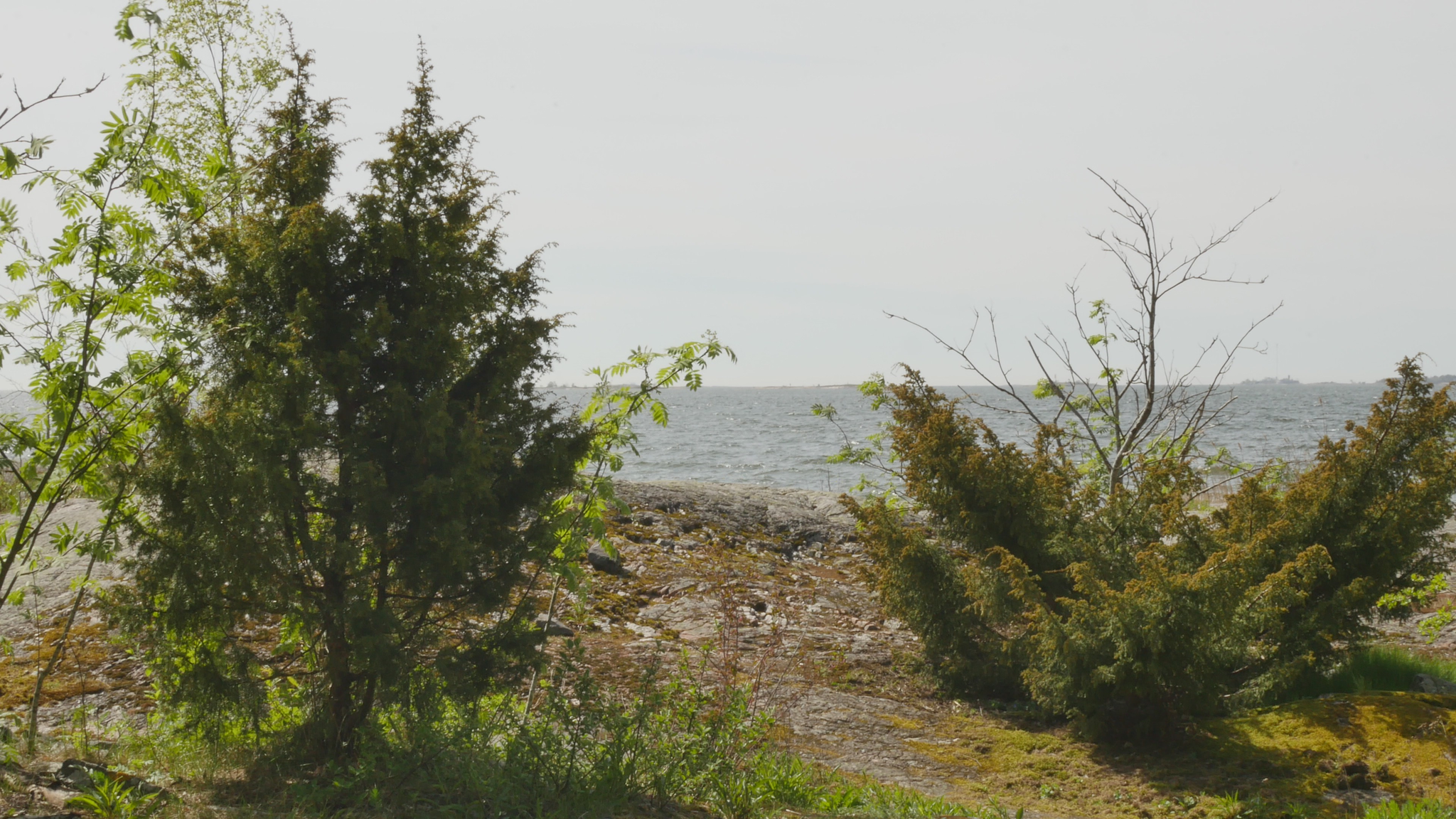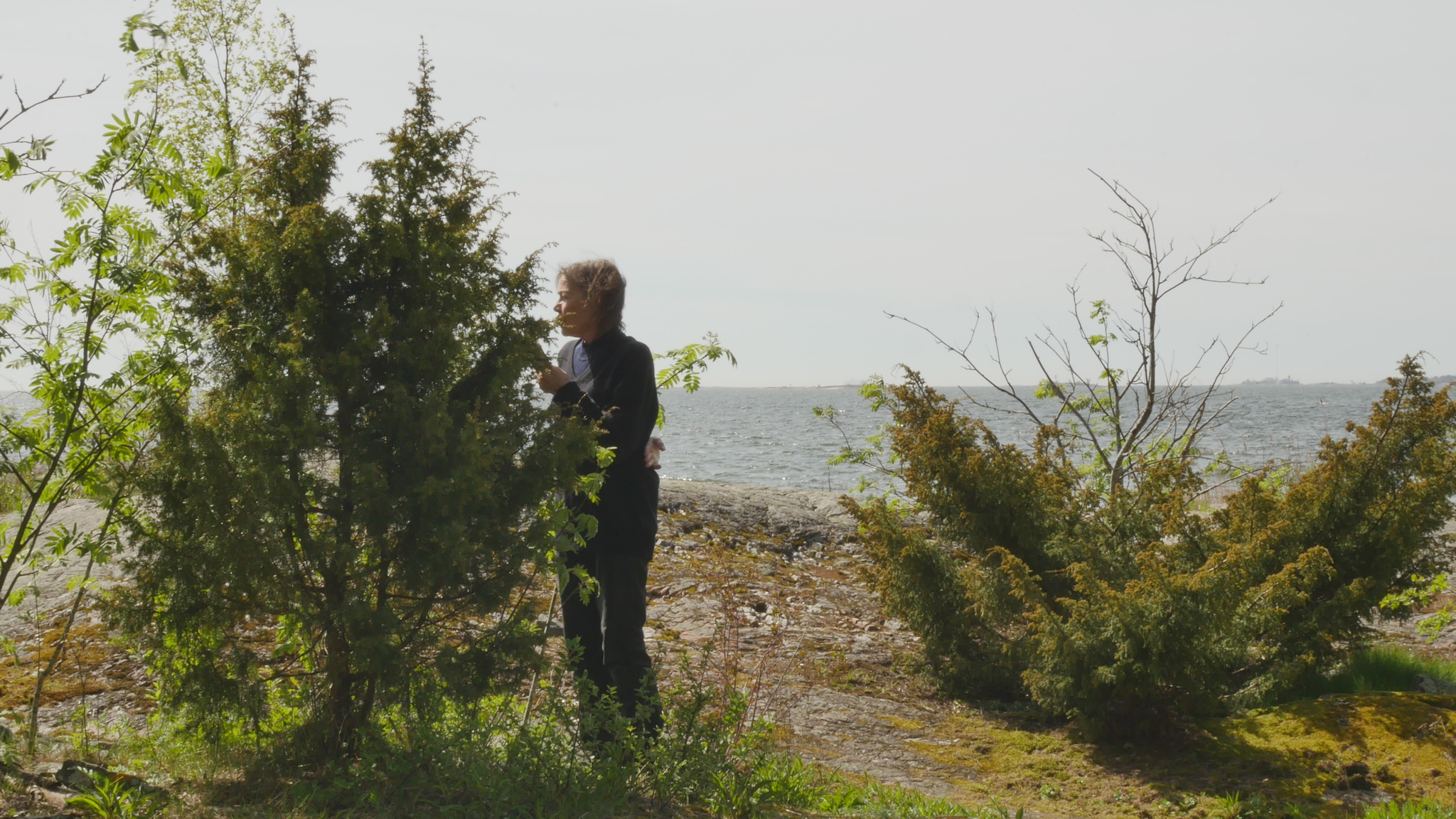 I have been working with junipers before more than ten years ago and at that time I was often holding on the junipers, but I was covered in a green scarf and that was very different. I was not trying to talk with you at all. And that is what I'm trying to do this time and to learn more about you. The reason why I came here to the sea fortress is because I hope to find studio here, to be able to rent a small working space here next year. Because I have to leave my studio on Harakka, and because Suomenlinna is sort of the mother island of Harakka, too, in ancient times at least. It felt somehow natural to come here because I want to be by the sea. But I've been also talking a lot with pine trees and in some sense pine trees are of course very, very beautiful and exciting, but I always when I worked with you, junipers, I always thought you were very special. One reason is maybe because my grandmother, my mother's mother loved junipers. And in the garden or in the area around the cottage in the countryside we were never allowed to cut down any junipers so there's plenty of old and young and small junipers growing all around the house, I think. There is a lot of mythological knowledge about junipers also in in Finnish folklore, but globally in different cultures. And I read some of it on the ferry coming here. And there was one detail that I remember, which I thought was funny, which was this idea that if you were to pick juniper berries you should remove your hat or your cap. And of course, removing your cap is a sign of respect so maybe that was thought of as a sign of respect, too. I don't see any berries on you, so I suppose you are a male juniper because the junipers are either male or female. And I guess the female ones have berries but sometimes also the form is different. So, you're more upright so you could be a male one also based on the form, whereas your neighbour nearby, closer to the sea, is more like spread out and it could be a female one. But that is not always correct because I met a juniper in Stockholm, and it was very tall, but it had berries. Now I say it because in finish we can say ‘se’ even of human being, so it doesn't mean that I think you're dead or an object if I call you an ‘it’. But in English maybe I should say you, they, or he, maybe you are he, I don't know. Today it's a very beautiful day to begin these conversations because there is almost no wind so this recording is not disturbed by the sound of the wind. I don't have so much to tell you yet so it's more like getting to know you a little bit. I also stand sort of partly behind you because here you have a small branch that I can easily hold onto even though it's very small so it's not really for support. I can see that your trunk is substantial so you're not a youngster even though you're not that tall. But I guess this is also not a very easy place to live in because normally you would have quite a lot of wind here on the cliffs. B I also know that junipers are very strong and resilient and can live in harsh circumstances. So yeah, I respect you for that. And in many cultures, you're the symbol of both death and rebirth. I don't think in Finnish folklore, it's not necessary that, but the smoke from your branches is used for cleaning purposes, also cleaning sort of spiritual cleaning. I've never experienced that, but they say that you can make like a ‘vihta’, what we usually, a broom out of Birch leaves, which we use to clean ourselves with in the Sauna. That you can make a broom out of juniper branches and have your aroma in the sauna, but with your sharp small needles using you for sort of brushing myself with, well, that's probably not very pleasant. But I thought I'd ask permission from you to take a small branch of you or maybe two, to put on my door, because that will protect the house from evil spirits and witches and so on. And then maybe another small branch to try to see if I could burn it to get some smoke to clean inside the house. I will try to take the branches from down on you, so not from the top branches and I hope it doesn't hurt too much. I'm very grateful and I realise it's quite rude to take something from you already during this our first meeting. But I thought it would be also a symbol so I could carry you with me in some way. And for the next meeting I will try to find something I could give you as a gift in exchange, but at the moment I don't have anything with me. I apologise for that. Anyway, thank you for this first encounter and I look forward to our next meeting, and yes thank you, thank you. And take care.