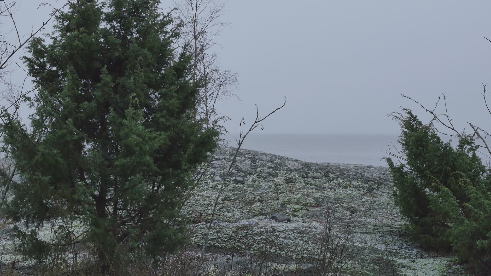 Hello juniper, good Monday afternoon, early afternoon. The first snow of the year just started a few minutes ago and it's interesting to see if it will remain even for a while because the temperature is above 0. There are lots of people around walking; somebody is coming past here right at the moment. And I hope they will go away soon but obviously they will come back the same road. Many tourists come to Helsinki during the Christmas break so of course they come here as well. So, it's the 22nd of December. Usually, the first snow arrives in November and then melts away but these are strange times. The winters get shorter and shorter; the climate is certainly changing. But you look good and I'm happy to see you refreshed by the soft snowflakes even though they would melt and turn to water. It's actually still the winter solstice, which was technically yesterday but of course the turning point is slow. But today the night is a little bit shorter than yesterday, or the day is a little bit longer, a few seconds, but soon the change will be felt, in a few weeks already, I hope. And that's important for you I know, or I suppose because light, that's your energy or a crucial part of it. So, happy winter solstice; we've managed it so far. Of course, the cold winter, what there will be of that is coming now in in January, February. And then the light increases but the cold increases too. It’s the sea, because the sea is like a giant warming element; it's still rather warm, well, not warm but it's nowhere near freezing yet. Since we last met in November I've been to Fortaleza in Brazil near the equator in a conference and I had the chance to walk on the beach there too. Really hot, but it was great to see the sun and have some light, although the flight there and back was exhausting and bad for the climate and so on. But the conference was great and one of the things, we have a working group there and our way of working is that we present some problem that then somebody else responds to by creating a performance or response through their own practise. And my problem or preoccupation was somehow related to you, to the crossroads I find myself at. The theme of the conference was cruzo, cruising and crossroads. And the crossroads is simply that I am not going to continue with conversations with junipers next year, nor with any trees to begin with or no like regular conversations like we've had once a month. I might speak to some juniper that I encounter on some trip, or I might find some other tree to befriend near my new studio when I get the new studio. Because unlike when we met for the first time in January this year, when this year began and when I thought that I would find a studio here on Suomenlinna, I now know that I will not. And I've been actually trying to apply for even for two studios in another place near the city centre, but I haven't had luck with those either yet. So, I don't know where my new studio will be but if there will be some trees next to that studio… Oh God, there's plenty of people walking here; this was the third group. Well, I understand that they appreciate this area because this is nice but anyway, so unlike my plan to get accustomed and used to and get to know this island where I would have my new studio I have now spent this year accepting the fact that this will not be the place where I'm going to work. That also means that I might not meet you again unless I come to visit you specifically because this is not a place you walk by unless you deliberately want to go and see the shore, like obviously some people want to do. And now there is some aeroplane or helicopter passing by; I can hear the sound of the motors. But yes, so this is our last meeting. And that's of course in some ways sad but also in a strange way a relief. What do I mean with relief? Well, the duty of coming here and the duty of finding something reasonable or interesting to tell you. I'm glad to get rid of that duty but at the same time I will really miss you, because I think you're beautiful and meeting you has been refreshing and invigorating for me too. I could tell you that I'm reading a book right now which is called the new long life and it's written by Scott and Gratton or something like that, an economist and a sociologists, and they speak about the changing world when people live longer and have to work longer to cover for their pensions, and also where AI and other technological devices will do a lot of the jobs, so there might be a lot of difficulties. Well, this has been my first year of retirement so I don't have to worry about that, but I really think I would like to work more. Of course, I do some work as an artist, but I could teach more; both doctoral candidates that I've been supervising are now finishing their work. But let's see what next year will bring with it. I thank you for this year and [for] keeping me company for this change or transition, which have sort of already begun this year because I have to leave my own studio in the spring, so I've tried to go through some materials and throw away some things. But the real change will then culminate only next year, and without your assistance. But anyway, I wish you a really, really happy winter solstice and Yuletide and New Year and I want to thank you for your companionship and partnership in performance during this year -25. So thank you thank you thank you and all the best for the future.