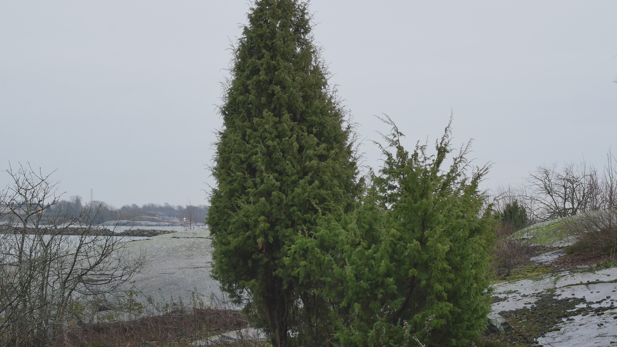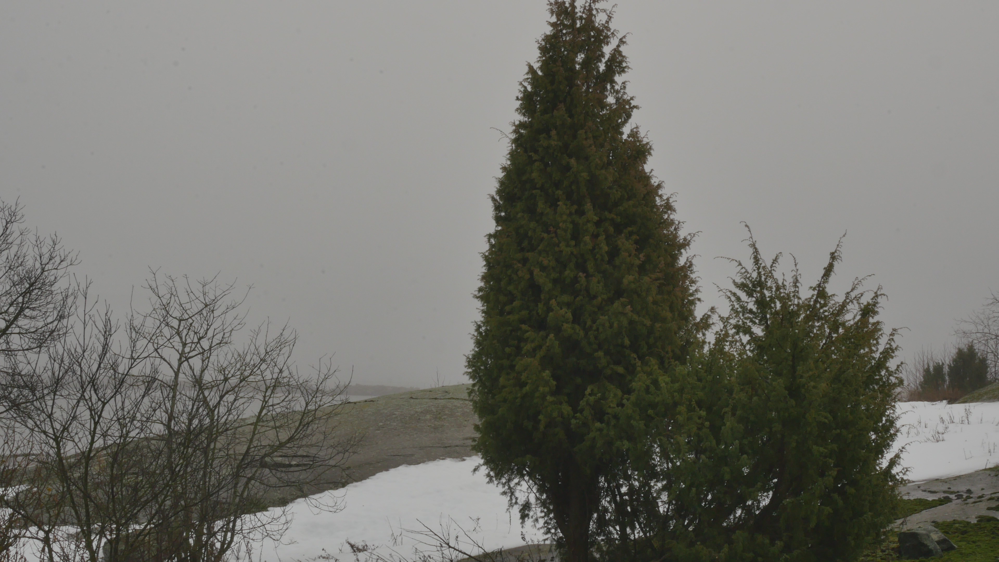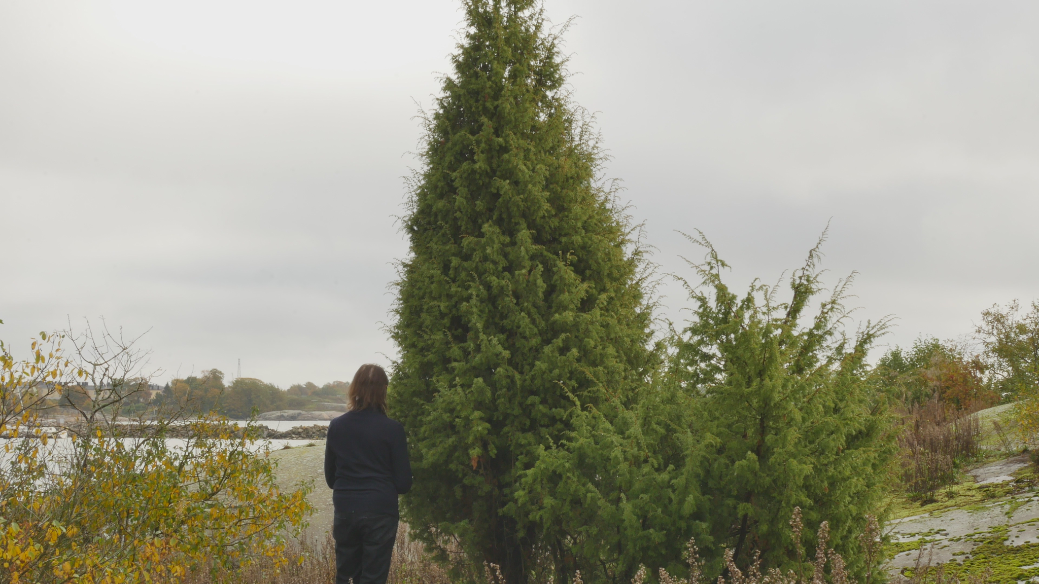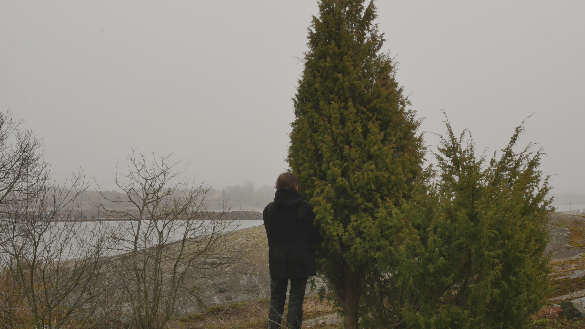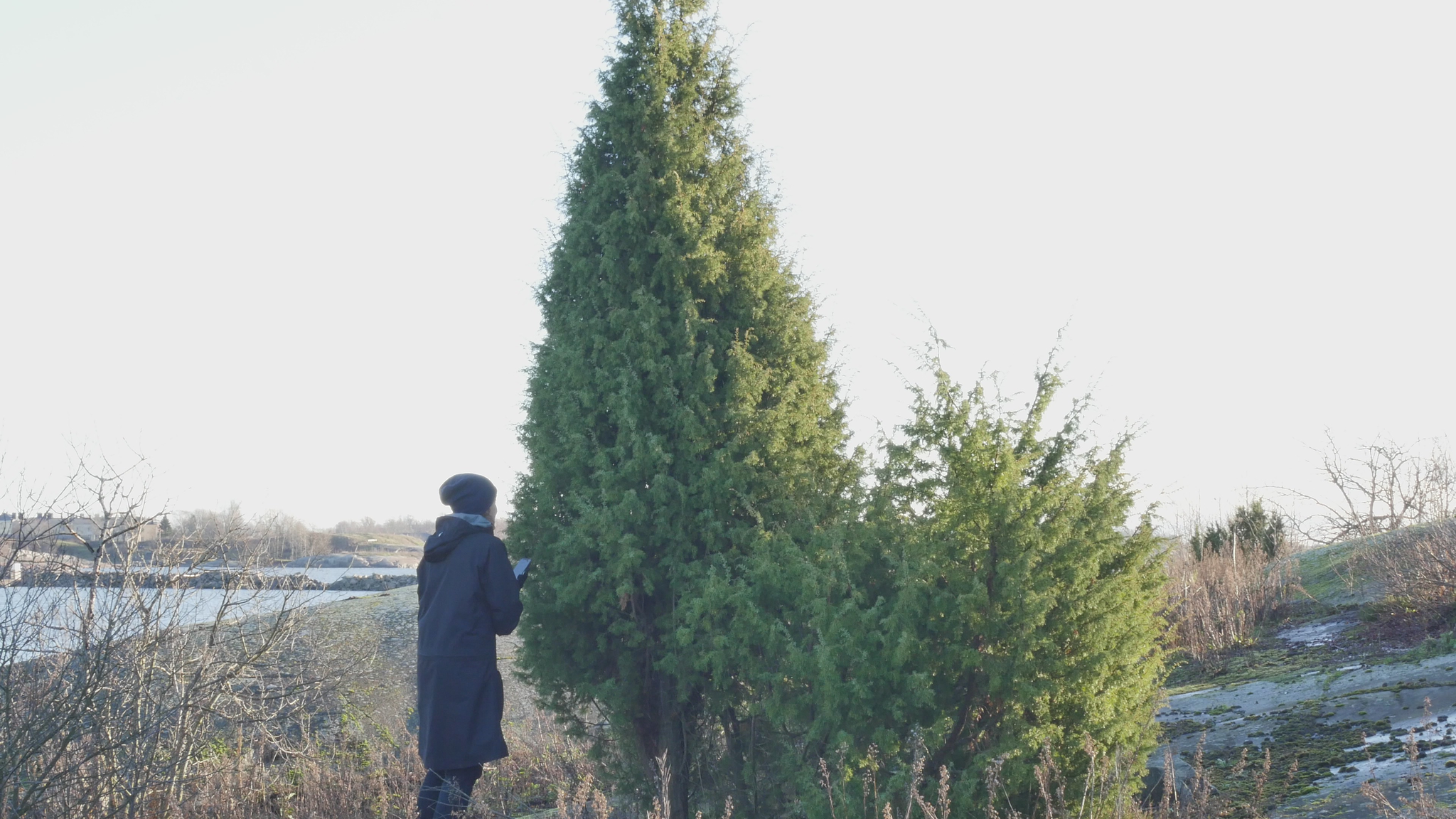 Hello Juniper, good foggy day. I am stunned that you are so big and bulky and look so old. And yet I know for sure that 14 years ago, in 2011, when I visited the juniper growing right near you on a weekly basis, you didn't exist. Or if you did exist, you were so small you were hidden by moss and rock plants. It seems inconceivable. How a big, huge tree like you could be only 14 years old. Can I be sure that I haven't become a fool in my old age. But still, why not? Why not? Anyway, it's great to be able to come to you. And now I know this too, that as you grow here side by side, you are like male and, how should I put it. Because junipers, unlike most other trees, have separate male and female individuals. But then you do grow in this way, conveniently side by side. And although I don't see any berries anywhere now, I did find a few berries on your neighbour or maybe your partner, because you grow so close to each other, to prove that it might be the female. But the classic shapes, your upright form and then the spreading form of the other junipers, also sort of correspond to our images of males and females. Absurd, why am I talking like this to you? The reason why I come to you today – it is the birthday of art, January 17th, 2025 – is because this is my last full year here on Harakka Island. I've had a studio here for a long time, since '97, and I thought it was time to say a long goodbye, a slow goodbye, a quiet goodbye, a reverent goodbye during this year. And at first, of course, I thought I could approach the spruce tree in the middle of the island, which I have written to occasionally. But then I remembered how much I had enjoyed engaging with junipers back in the day. And I have met other junipers, one in Suomenlinna and another in Stockholm, so I decided to come to you. And originally, I thought I would come to your relative, who grows nearby and whom I used to visit a lot back then. But when I saw you and that you are so huge and handsome all of a sudden, naturallyI wanted to come and talk to you. Of course, it's kind of crazy that I, as an old woman, can tell you things about this island that you wouldn't know because you're young. Usually, trees are older than people and it is somehow self-evident that trees outlive human life. And perhaps you too, surely your life will continue long, long after I am gone. And not only from the island, but from the whole world, because you junipers can live to be a thousand years old in extreme cases, but at least for many hundreds of years. But the idea that you're young, you're the first really young tree I've ever talked to. And now that I see how tall you've grown in such a short time, I wonder if my other juniper friends have been really young, even though I've treated them with the same respect as older people. Be that as it may, however, I would like, not only to tell you what life was like in Harakka before you were here, or what the junipers were like here, perhaps something about them, but even more I would like to get to know you and your way of looking at the world. I'm holding on to your branch now and I remember very well how important the physical contact was that we had with your relative or ancestor or who knows, even your mother, who is still growing near here. And how it's not at all obvious with a juniper like this, which is prickly and feels like you're not necessarily inviting at all, but here you have a little branch that I can hold on to and feel like I can connect with you directly. Maybe all I want to say this time is thank you for letting me come to you. And I interpret your silence or your acquiescence as a kind of consent in the sense that I feel that you are not resisting, not fighting back. You agree that I will come to you, say once a month. Thank you for that and I will see you again soon. And all the best to you here in the mist of winter. Thank you.