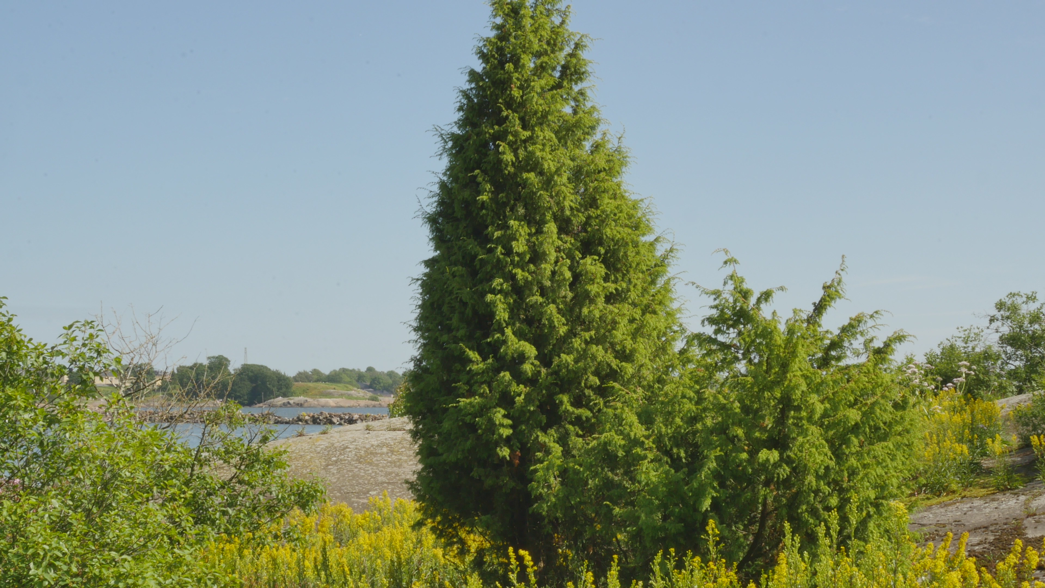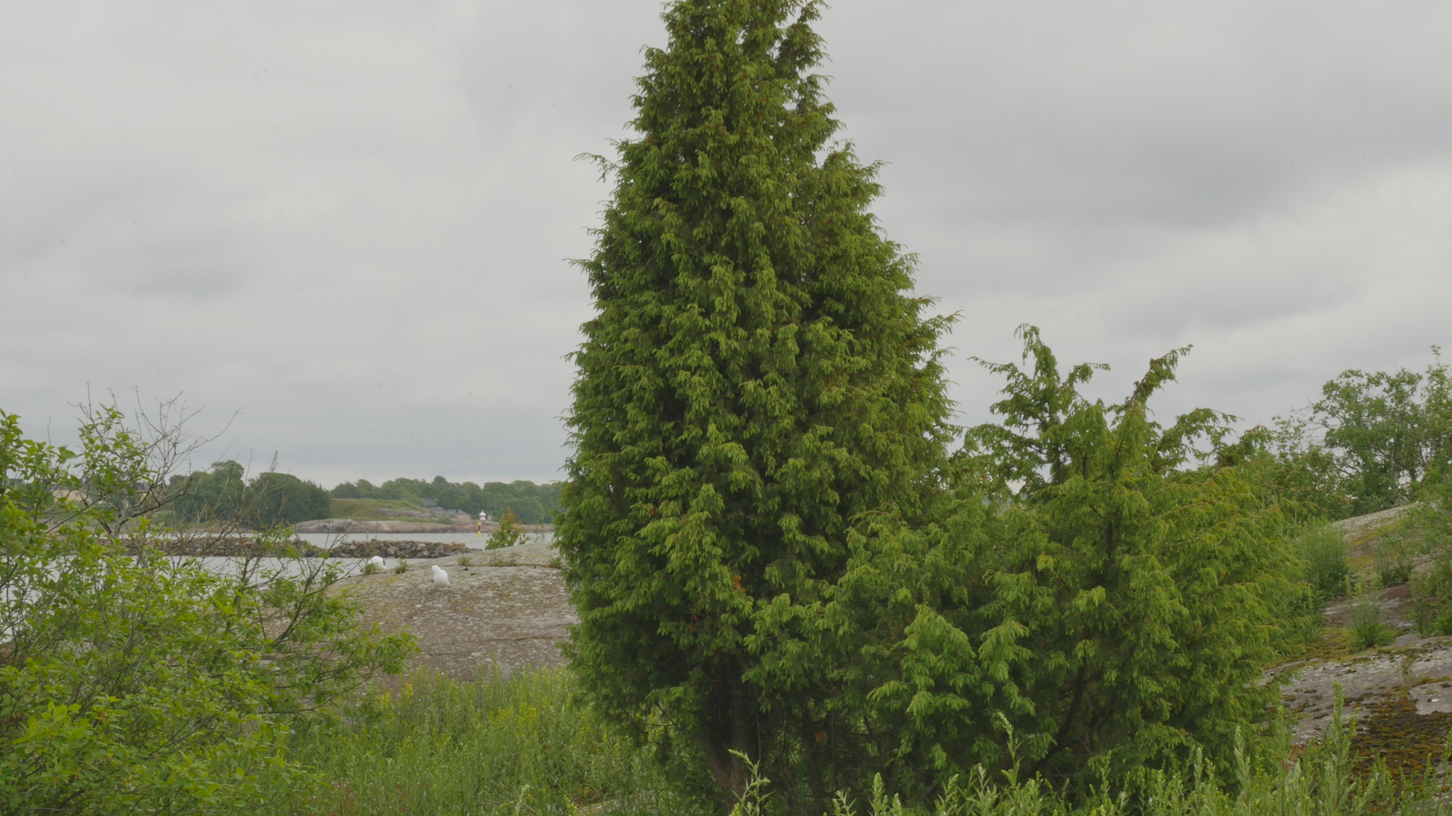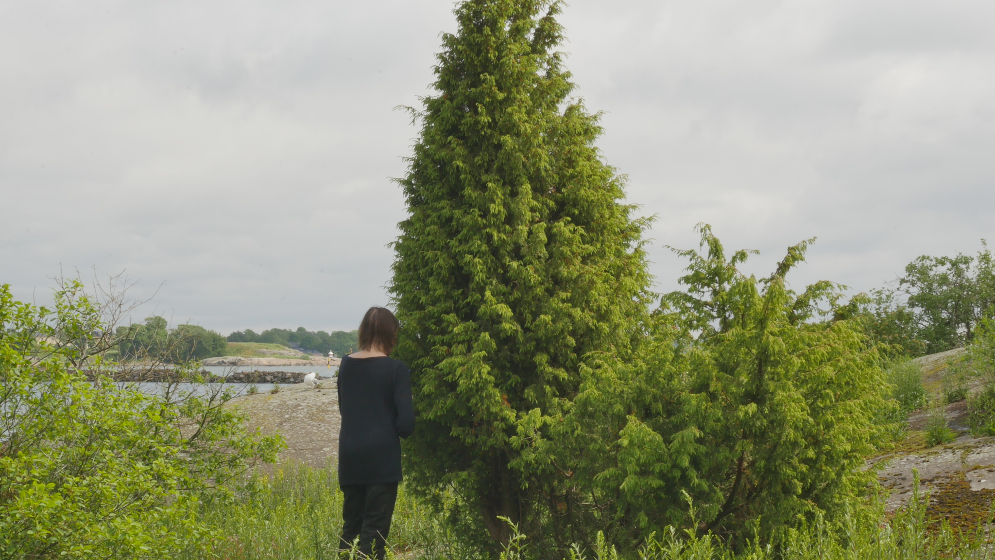 Hello juniper, nice to see you again. It's June and at this time of year the landscape changes rapidly. The last time I was here in May the bushes next to me barely had leaves but now there is green everywhere. And above all, around you and on the cliff in front of you, there are huge numbers of goldenrods soon bursting into bloom. I don't remember ever seeing such a huge number of golden rods here, in this area. It could be because of the geese, because when they defecate all over the place, they fertilize the soil and then the plants thrive. Today the wind is coming from a strange direction, or strange, but I mean it so often comes from the west or south-west here, now it's coming from the north or north-west, maybe. But we're still pretty well sheltered here. And your new needles are gorgeous, really pale yellow and fluffy and there are lots of them. I mean, you're growing fast, both in length and width, especially. It's soon Midsummer and I was remembering, when I was wondering what I could tell you about, I couldn't think of any special Midsummer memories, except that I remember spending one Midsummer here video recording the Midsummer of the Year of the Monkey, sort of the whole day and night every two hours. But I looked it up and it was, it wasn't the summer solstice, it was the twenty-fourth and twenty-fifth, or Midsummer Eve and Midsummer Day on the old calendar. And then, it was the Year of the Monkey 2005, 2004-2005, the third year that I recorded the whole year, as it were. And it was there on the northwestern cliff or western cliff, but still on the ledge where I had been sitting for six months by then. And I remember that was the only day and night that I recorded using two cameras. I had an old video camera and then I had got a new better one and I set them up to shoot at the same time sort of diagonally me sitting on that ledge and of course the cliff and the seascape. And the pictures show very well how it never really got completely dark but there was a kind of dim lighting even at midnight. Well, this year I'm not planning to come to you on Midsummer, but I remembered that too. In fact, I have celebrated many holidays, Easter and Christmas Day and well the second Christmas Day, not Christmas Eve but Christmas any way, May Day and many others. When I was thinking what to tell you, it was difficult for me to remember something I could tell you about here in Harakka, but today is Kaisa Pajanen's farewell party. She is retiring and I felt that - the head of the Urban Environment Division or some kind of supervisor who has been an important person here in Harakka - and I can't remember now when she, when I met her for the first time. It may well be that she's been here about as long as I have, at least since 2000 or so. But I came here in '97 and the first artists came already in '89 I think. Well, but anyway it's her farewell party and it makes me think of this community as it were. Another reason why I'm thinking about this community is of course because I've just come back from Cologne in Germany where I attended a meeting of this Performance as Research working group. And I've been part of that working group since its inception, actually since 2004, although the first official meeting was when this conference of theatre researchers was in Helsinki in 2006. And now that I think about it, actually none of the other artist-researchers who were there this year were actually involved at that time. But of course, Mark Fleishmann from Capetown, for example, who visited the group but is no longer an active member, he was there at the time I think in Helsinki. Well, why I tell you about this is that the reason why I go to Cologne and participate in the conference, certainly more than half of the reason is that I think it is so nice to meet that community, the group of people who meet in different parts of the world at conferences once a year. And that's of course a completely different way of forming a community, although it changes and shifts, because the people stay the same but the place is always new. But here in Harakka the place stays and the people change, not every year of course, but all the time new people come, and some people leave. And now that it's my turn after all these years, when it's my turn to leave, of course I'm sad about it. But it is also exciting, and I also know that although it may seem that this island is here and you can come here even if you don't have a studio here, very few of those who have worked here before do take an active part in the opening of exhibitions or other public events. So, each time has its time as they say. Well, there is still time for me to enjoy this summer and next winter. But community is important in a way, one can belong to so many communities and in so many different ways. What I should be doing now, and what I will be doing today after I've sort of transcribed this meeting of ours and edited it, is to prepare for tomorrow night, because then we have a meeting online with a working group of artistic research, which is part of another international conference, Performance Studies international. And in that working group I am currently, or have been for several years, one of the three chairs or convenors. And we have our own way of working, which we always vary it a little bit, but it's kind of based on the fact that instead of talking about each other's performances we make performances as a response to each other's performances. And I have this time the task of creating a response or reaction to the work of Denis Ackerl from Austria, which is very interesting. Once before I have been allotted to respond to her work but this time, I chose another way. She performs as a mermaid and calls, I mean dressed in this huge artificial fish tail and that's, she does both performances and videos as this hybrid of woman and animal and that of course is like from a feminist point of view hilarious and absolutely stunning some of her w