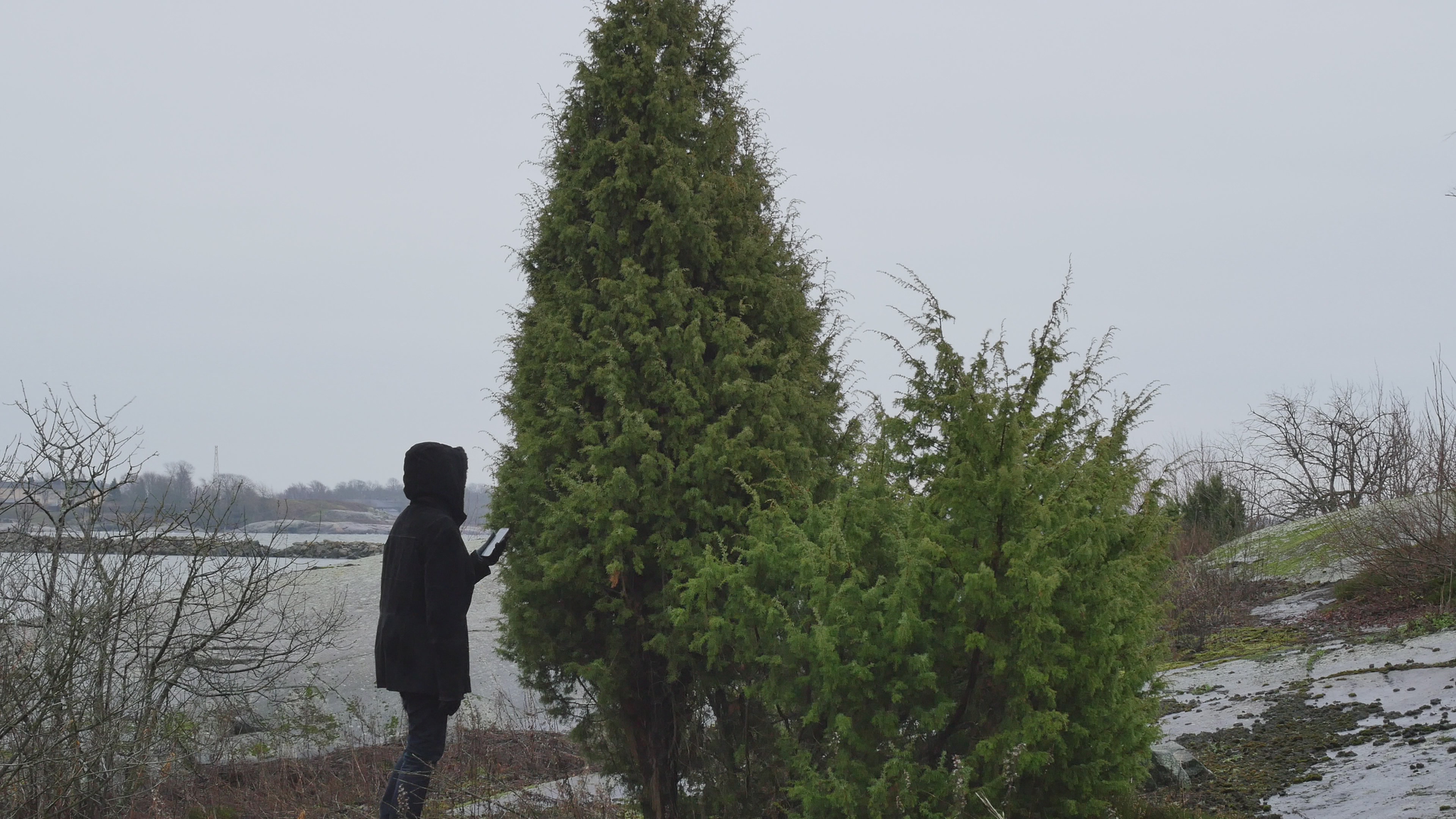 Hello again Juniper, have a good Tuesday. It is now March 18th and only a few days to the spring equinox when day and night are equally long. In other words, now begins the bright season, our favourite season, and your season of hard work, although I'm sure it has already begun. Spring was already well under way but a few days ago there was a huge amount of snow, which has now mostly melted again. When we last met, we were expecting ice and the boats were lifted ashore, but there never was any ice really. Now all the boats are in the water and the summer season has started in that sense. Today the wind is from the north-west and not very strong so there is no swell to speak of. On the way here it was a tailwind and, on the way home, it will probably be headwind but not so strong. Here on the south-eastern shore, we are well sheltered from the wind, indeed. I think you've grown even more since I last saw you, but maybe that's because you're so lush and green now. And I noticed when I was setting up my camera tripod on the rock over there and trying to find the right spot that now that the snow has melted but the grass and leaves haven't broken out yet, there are plenty of junipers, by any measure, little junipers all over the place and bigger ones too. This whole south-eastern slope, from the bird watchers’ hut onwards, is a veritable kingdom of junipers. Basically, there is a rope, so we are just on the side of the nature reserve, the area where you should not step on during the nesting season, but this is right here on the edge, so it is unlikely to disturb the birds. I must in fact remember to put some branches here next to this place, so that no goose will come to make a nest right here where I stand now, because they come every year more and more of them and they are already starting to be crowded. Well, not yet, but in April. Last time I told you about the first time I came here but now when I thought about the ice situation, I remembered that the last time there was no ice at all, for sure, that no one could walk across the ice to get here, was, I think, in the year two thousand and eight. This year there was no ice anyway, but just at the point when it might freeze at least a little bit, then someone had driven a boat through. Well, but it wouldn't have made any real ice anyway. And a similar situation was in year two thousand and eight. And why I remember that is because in the years two thousand and two and up to the year two thousand and fourteen I filmed a series of what I called Animal Years. So once a week I stood in front of the camera like this, not talking to anybody but standing or sitting or walking or all three, in one place, in the same place for a year, but once a week, unless there was something unexpected like thaw season or a trip or something. And I was always wearing a different color scarf. Some years it was the same scarf for two years, but still. And they were sort of 'still acts', standing still, becoming still. But of course, when you edited them together it became a kind of diary of the year, a depiction of the changes in the landscape. I've written a lot about it, a whole book, which came out last year, How to Do Things with Artistic Research - Animal Years Revisited, because later, a few years ago, I even went back to those places to remember if I could remember where I was standing or sitting and what I was doing and how the landscape had changed in the more than ten years since I'd last been here. And in a similar way, I stood here with your relative and held him or her by the branch just as I'm holding you now, there a little higher up, further ahead. But then I was wearing a green scarf, which was on my head, so that I was completely covered by the scarf, and it was a terribly pleasant experience. So that was in the year two thousand and eleven I think it was, yes. But now, why this is relevant again is that two years ago there was an exhibition here, another Artists' Island exhibition curated by Elisa Suvanto and Anna Jensen. And they helped me to realize a long-time dream, a compilation of sorts of these Animal Years here on the island so that on these filming locations - in some years there was more than one filming location but for this work one location per year was chosen - so a small metal sign with a QR code was placed on the filming locations. And the QR code is such that, when you point your phone at it, it links directly to a website, which then had a short version of the video shot from that location. And the idea was that it would be a more or less permanent work here on the island. Those signs are quite inconspicuous and it's not easy to find them either but the sign referring to the performance with your relative or the video of it is still here on that wooden pole with the rope attached to it that you're not allowed to cross. But it happened so badly that when I went to check the signs last summer, the QR codes no longer worked because the program I had used to create the QR codes, amazingly enough, which was a freeware program of some sort, had changed its policy so that it suddenly demanded a monthly fee for each QR code. And I was quite shocked, because it would be a huge amount of money, like twelve times the monthly fee every month, so it didn't make any sense. And I wondered why, had I made the wrong kind of QR codes, the kind whose links could be changed, or how was it possible that the software used to make the QR codes still had the opportunity to influence them. If I type something on a typewriter, the program cannot change the text afterwards, except perhaps if it is on a computer and not printed on paper. But when these were printed on metal plates, it seems so absurd. Be that as it may, then in the autumn I made a sort of poster, telling people that these QR codes do not work, but then I put links to my website on the poster. But for this work to make any sense, of course I should renew the signs. And that will now be a
