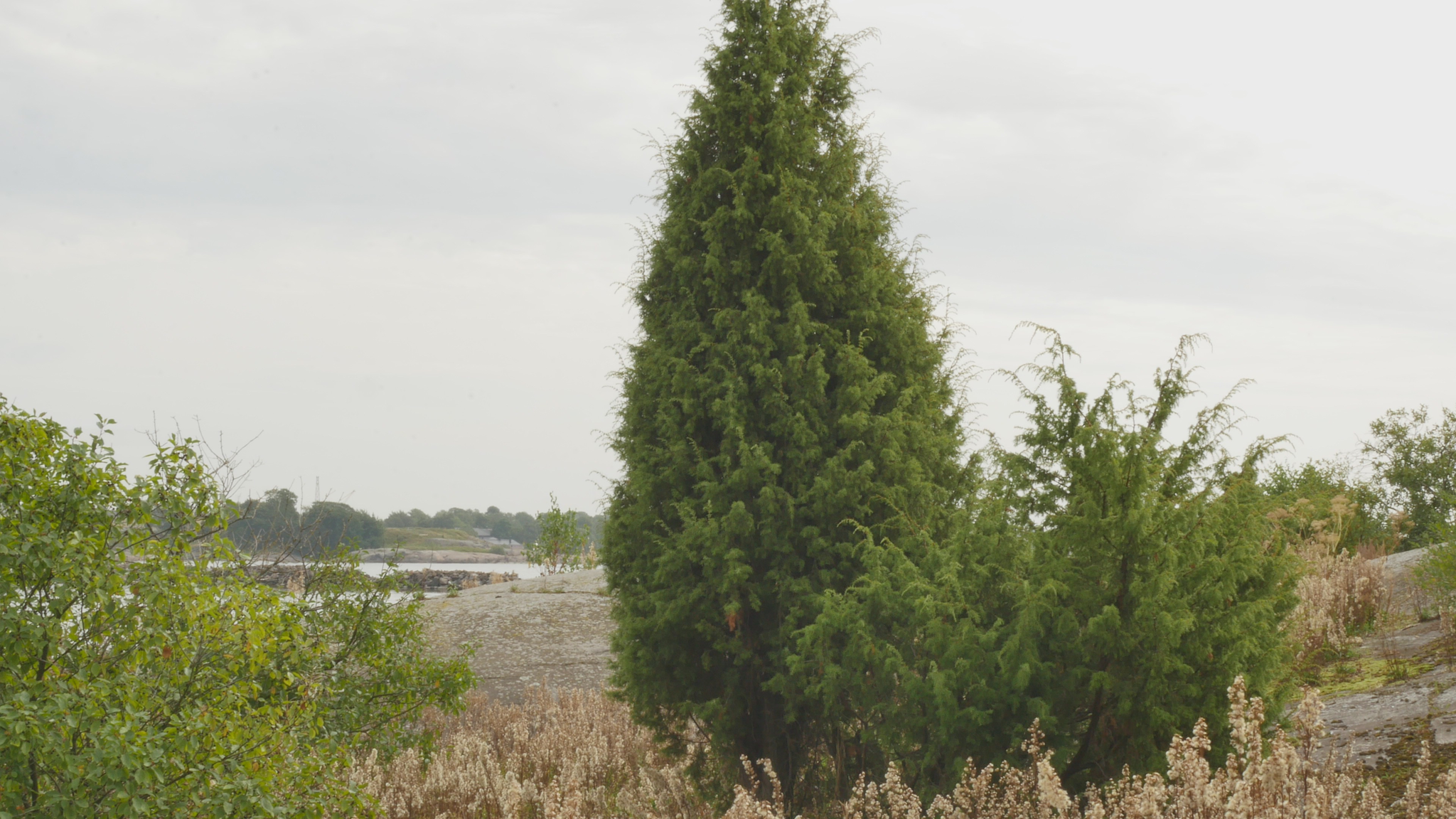 Hello, juniper, happy August. Today is the fifteenth of August, and you can certainly see that in the landscape. It could almost be the end of August because the goldenrod, which was so abundant this year, has now all withered and is sticking out dry, brown, and pale seed heads all around me, but you are green and thriving and look really healthy. The weather is strange today, warm, almost completely calm and cloudy. Rain is forecast for the evening. People keep saying that the heatwave is over, but apart from a few isolated showers and thunderstorms, this summer weather continues. It's 26 degrees inside my home, even though I keep the window open all night, and it's already cooler than it was on the hottest days. Well, I'm apparently the only artist on the island today—I don't know, probably because yesterday was arts night, or for now, if people come later—said Eddy, the island's caretaker, if you can call him that. And I'm here because I'm gallery sitting in my own exhibition in the Telegraph gallery, which is called More Pines. And the idea was to see how many solo exhibitions I've had here on the island, because we have not organized solo exhibitions in the Telegraph gallery every year. And this year there are so many of us that the exhibitions only last a week. It doesn't really feel like a vacation in the same way as before—I always used to say that I was moving to the cottage for two weeks of compulsory vacation when I moved my computer to the kitchen in the Telegraph and watched the exhibition there for two weeks. Now it's only a week, today is already Friday, with only two days left. But yes, almost every year I've had an exhibition here in the summer, and of course I've participated in joint exhibitions, so if there had been an exhibition every year, there would have been 28. But let's say that if there are 20, that's pretty good, I mean solo exhibitions. I think the first one was in 2001 or something like that, which featured material from the performance Missä kivi puhuu (Where Rock Speaks), which was a collaboration with Radioteatteri (Radio Theater) and was part of the Capital of Culture program in 2000, including a performance, a series of installations, and a radio play. And I made videos of the small stones that were on display in the second casemate, each of which spoke its own monologue from a tiny speaker, read by Radio Theater actors. And I think those were the first exhibition that was there in the Telegraph. One of the early ones was also one called Soliseva laakso (Murmuring Valley), which I had made, it was mainly a sound piece, that I had made in the village of Farrera de Pallars in the Pyrenees during a residency in September 1999. I don't know, perhaps it was the first one after all. Well, be that as it may, this time there are only two videos on display with pine trees growing in Kaivopuisto Park. One is called For the Pine of the Year, and it was recorded with a small pine tree in Kaivopuisto Park, which I play the harmonica to, or rather, I don't play it, I just breathe audibly through the harmonica once a month. And then there are two other pine trees in the same picture, which are on the shore, and everyone recognizes them because they are such a landmark on the shore of Kaivopuisto Park. I sit on a rock next to them and read to them excerpts from a textbook about pine trees, as if I were studying pine trees with the pine trees. It's over three hours long when I've combined all 12 parts, so now someone can listen to a small excerpt or something. At the opening, I played both sounds from loudspeakers, but quietly, so that they seemed to merge or complement each other, and it sounded quite nice, but one of the visitors complained that they couldn't understand the text at all, even though they were sitting right next to it, so now I've added headphones. Well, but I wasn't supposed to talk about that. Actually, I was supposed to reminisce about some old exhibitions, but I also have to tell you about a book I recently finished reading, which I have been reading on and off. It's one of my Stockholm books, The Second Nature by the American science journalist Michael Pollan, who describes his experiences as a gardener. It deals quite comprehensively with people's relationship with nature, especially Americans’, through the medium of gardens and gardening ideas. It is divided into four parts, spring, summer, autumn, and winter, and includes some philosophy and literature, writers' views, but also garden catalogs and rose breeding and composting. It is a very entertaining and interesting book, published sometime in the late 1990s or early 2000s. And of course, it reminded me of, even though I myself have very little experience of gardening – it's mainly a matter of sawing off trees that are growing, small trees that are growing in the wrong places. And in some cases, I use garden shears or even pull them up by the roots. Well, that is of course also central to gardening, making choices about what to let grow and what not to let grow. But why, and how this relates to you, is that in a certain sense, the entire island of Harakka is a kind of garden. Well, of course it's absurd, because there are nature reserves here and the Environmental Center operates here, and certain areas are specifically preserved. But still, this is a garden in the sense that it is so completely man-made. Of course, one could argue that today the most active gardeners are the geese, who fertilize here efficiently and decide where there will be more vegetation and where there won't. But humans have had a tremendous impact on Harakka Island from the very beginning, when it was just a skerry where you came to hunt seals when the sea was much higher. But during the Russian era, for example, when soil was brought here and sand embankments and other structures were built, exotic weeds were brought along with them, and they have remained here since this was a military island and closed of