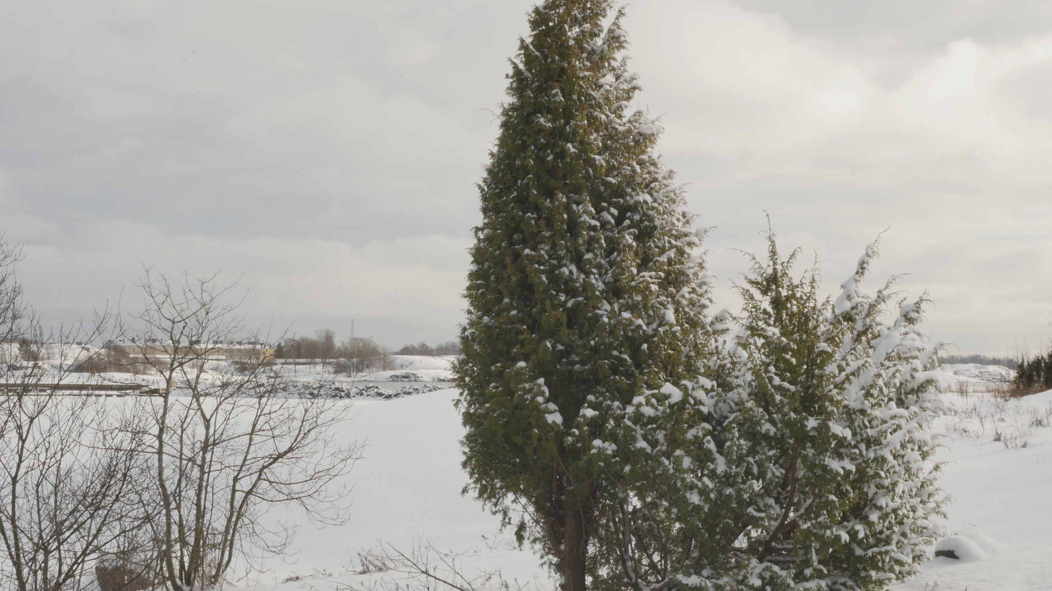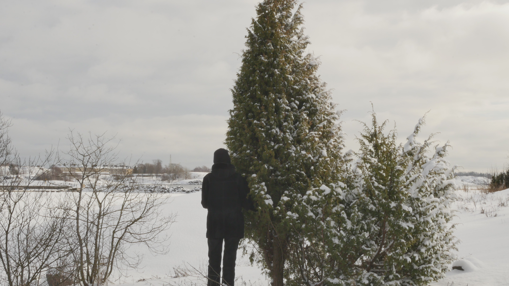 Hello juniper, good day juniper. Happy February juniper, or both junipers, but above all to you handsome. Nice to see you again, last time we met was in January and the world was a different place, not a trace of snow. Now a huge amount of snow has fallen last night and earlier and winter has come finally. It feels especially cold now as January was so mild and I thought winter wasn't coming at all, but then it came all at once. And maybe we'll be walking here to Harakka Island soon. Right now, I can see a man walking over to Särkkä, pulling a sledge behind him. That's pretty daring. We came in this morning at 9 o'clock, a whole bunch of artists with a studio here with Eddy's Buster through the ice floes. But Eddy even speculated that if the cold weather holds and there's not a strong wind, which is promised for Thursday or Friday, then we might still be able to look forward to ice by the end of the week. This has always been the source of excitement in Harakka all these years, when the ice will come and how decent the ice will be and whether it will be safe to walk and when it will melt. And, of course, when to take the boat up and when to put it in the sea again. Well, usually it's easy to see when you can launch the boat because rarely does the ice come back unless there's some ice floes that accumulate in the spring, but in the fall there can be thin ice and then it melts again when there's a storm. But now all the boats were taken up. I wasn't here to pick up the boats myself, but I saw from the message thread that the guys picked up all the boats last week when I was in Stockholm. Actually, it is in wintertime, when this island life feels special. But then again, if there is good ice, it is easy to walk here. It's kind of the easiest time of all if there is good ice. But not yet. When I was wondering what I could tell you about, because last time I promised to tell you memories of the island from the time when you didn't exist yet. It seems crazy when you're so big, but I remember when you didn't exist, or you were just a berry on your mother's branch, or however you want to express it. But the first time I came here to the island was, I think it was in the summer of '93 and I didn't come to see the studio at all, but we came to see the auditorium, on the advice of Marianna Kajantie, with Raija Ojala, the producer Raija Ojala. And there was going to be a performance of a version in the Some Conversations series. Alexander Vvedensky's play was done in 10 different versions, and I think this version for the Harakka Auditorium was the fourth scene, the fourth conversation, where they played cards. And then we used the military past of this island, with gas masks and whatnot. That was the reason why we came here that summer to see the space, even though the performances themselves were in December and January. I well remember that because of the ice we had to cancel a couple of shows in December because the ice was forming, and they didn't want to break it up because of the boat transport. And so, the shows had to be cancelled, but then in January we walked across the ice. But that's when I fell in love with this island and then I tried to find out when there might be some studio space available. Actually, it was later, because in '96, I think I was in Venice for a couple of weeks in the autumn. And there I realised that Helsinki is a city by the sea. Why haven't I explored the seashores here. And then I remembered Harakka Island and I started to investigate again. But I didn't get a studio here until -97, at least that's how I remember it. But I went and wondered, it was kind of August, when I went and wondered and walked around the house and met some people and saw that little, little 9 square meter room in the basement, which I then rented as my first studio here. That was a long time ago. And now I do feel a bit sad to leave but then again, the island has changed in many ways over the years. And of course, it's time, it's time to leave at some point. Just the thought of cleaning up your office is a huge task, but it's also a great challenge, because it would force you to rethink what you need to save, what you want to save and what new things you could start doing. Of course, I could tell you a lot of things, but I don't know how interesting it is for you. The biggest upheaval in this area, it was not so many years ago, was when they dug up this whole eastern shore and laid some kind of cable, whether it was to Särkkä or further away. And it looked like nature was never going to recover. This was like a big sand pit, this whole sand road here. But it did recover. Of course, the beautiful old alders didn't come back, they were destroyed, but new alders are growing now. And now my fingers are freezing. And you, although you are so beautiful and handsome, you don't warm me at all, even if you were a shelter from the wind, but now there is no wind. So, I'll just say thank you for this time. And I hope you enjoy the increasing light. And I'll come and see you again in March, either by boat, or if all goes well, even walking across the ice. Until then, goodbye and be well.