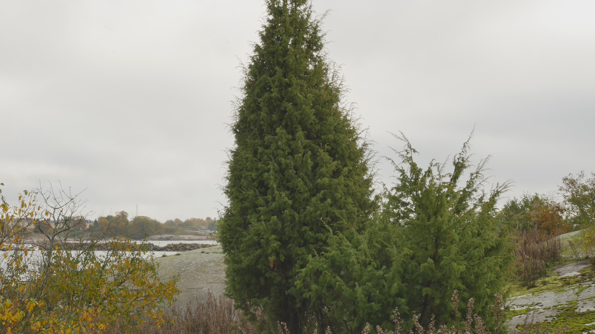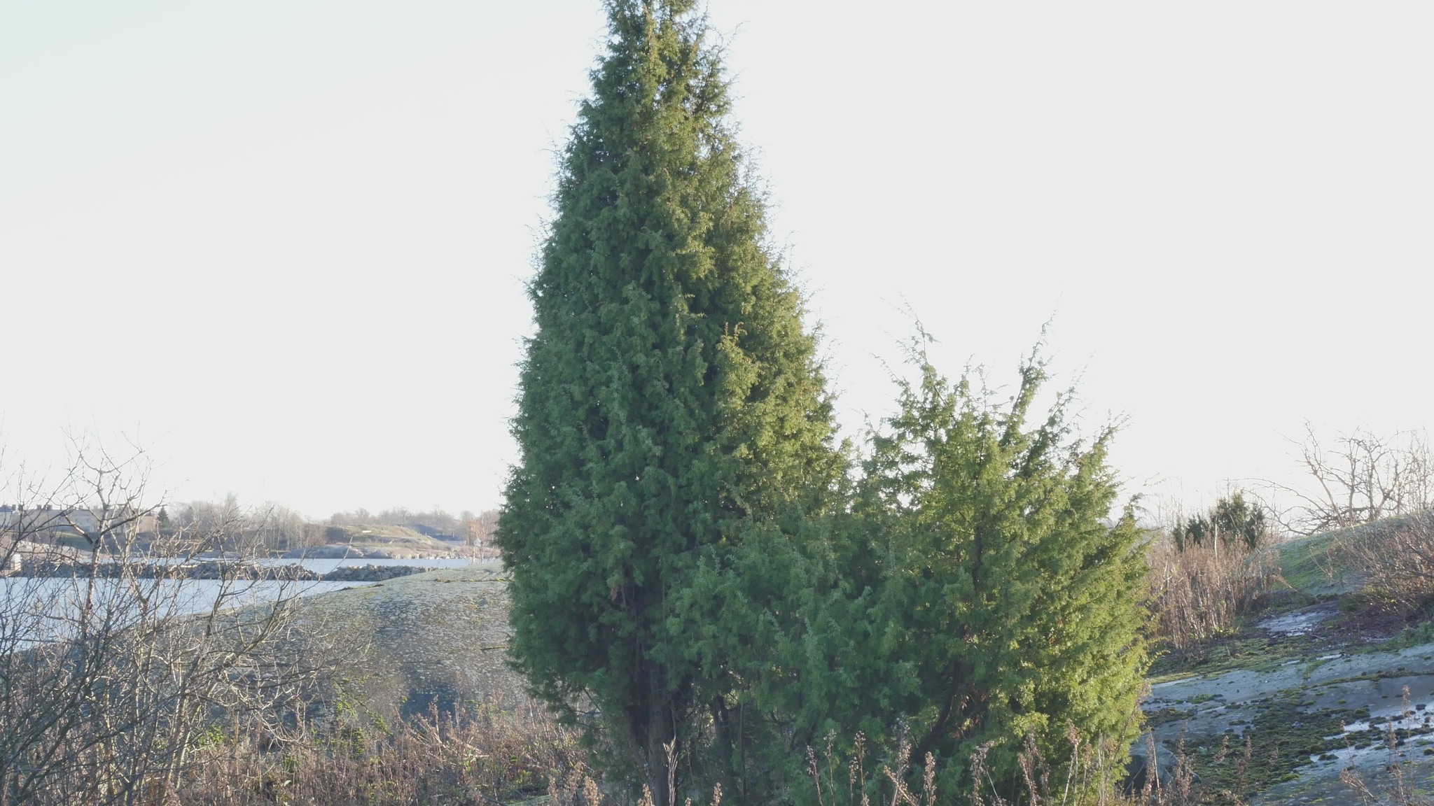 Good day, juniper, good sunny Friday morning. Today is November 14, and it finally feels like winter is coming. Just yesterday, there was a terrible autumn storm, it rained cats and dogs, and now there are no leaves left on the trees. All the deciduous trees are bare. And anyway, everything that sticks up even slightly above the ground is brown and grey. There are still lots of green leaves on the ground, green plants, and of course moss is green, but generally speaking, you junipers are in a special position here now. And, of course, the pines on the western shore. The sun is shining low and, as I walked here, it shone directly into my eyes, like a huge burst of energy. Now the sun is shining... but I am here, sort of in your shadow. And the wind does not reach here. It's a perfect day to talk to a juniper. I feel, as always, that you have grown even more, and why wouldn't you grow now that it has been wet and there is plenty of nourishment and... I wonder how tall you will grow before the wind starts to bother you. I was in Tallinn yesterday and the day before, and it was really rainy there, but I heard it rained here too. Otherwise, the island is quiet at this time of year, as the ferry no longer runs, so there are no visitors, the nature house is closed, and the people from the environmental centre are away. There are a few artists working at the artists' house, who come here by rowing boat. A few of us came here with Eddy on the Buster at ten in the morning. The rowboat Korento is on the shore and should be emptied, but since one of its oars is broken and moreover, I don't like rowing alone anymore, I came along with Eddie. That's the latest drama. Well, before I tell you about that, I can say that the reason why it's so busy here on the island, even though everything is closed, is because the window renovation is continuing. In other words, there is a large group of workers here who are installing new windows in the artists' house, and they have also renovated the windows in Eddy and Saara's home. And what I was about to tell you, the latest drama was when Saara Metsämäki sent a message saying that they would have to leave the island and that a new caretaker or new island manager would be coming here in January. The artists were horrified and tried to find out what had happened. It turned out that there was something fishy about the competitive bidding process that the city had announced for this task, so now they have filed a complaint, and we'll see what happens. But if Saara and Eddy really are leaving, then an entire era will come to an end here on the island. Of course, every artist thinks that an era will end when they leave, but Saara is the daughter of Paavo Metsämäki, and Paavo Metsämäki was the king of Harakka Island, a legendary caretaker and jack-of-all-trades, a fisherman and a drunkard, too, and a real character who took care of the island and ruled it in his own way when I came here in the nineties, and apparently from the very beginning. And then Saara, who is Paavo's daughter and married to Eddy, who is originally British, they have taken care of Paavo's duties through their own company. And since they are the only ones who live on the island, they are, in a way, the ones who know what happens here and how things are done and in what way, and the idea that they would not be here is terrifying to most of the artists. Well, let's see what happens. Today, I thought I would try to remember and tell you something about Paavo, but I realized that I don't have - I have very strong impressions of him and his comments at Harakka ry meetings in the library and so on, but I don't have any actual stories or anecdotes like many others surely do. In any case, despite all this chaos, I feel somehow oriented toward the future, and it seems difficult to reminisce about the past. It's as if I'm already leaving. Of course, this is partly because my room is half packed up due to the replacement of the windows, and I have already carried some things away from there, but most of my belongings are still there. But somehow, it's no longer in working order, there's not much I can do there right now, well, perhaps something. And I will get to see the new, beautiful windows, but I'm not going to put the curtains back up, for example, because I'm already leaving. Where to, I don't know yet. So, it seems I don’t have anything to tell you. Well, I can say that these junipers near you also look healthy, and judging by their shape, I would guess that they are female junipers, so to speak. But when I came here today and saw that all the greenery was gone and everything looked so bare, I noticed two new junipers, and not any young junipers, but full-grown junipers on the slope above the shed and the trash cans, below Eddy and Saara's house. And it's completely incomprehensible that I haven't seen them before. Of course, I haven't been looking for junipers on the island, but at one time I thought that this area where you are now growing, that this is the place where junipers can be found on Harakka. Of course, I've seen some small ones on the western cliffs and here in the passageway, this sandy passageway, well, it's not a passageway, but along the sandy road, when I go back from here towards the pier, there's a small juniper there since a long time. But these two large junipers, which are right on the slope, it's amazing that I haven't noticed them, but of course they are covered by foliage throughout the spring, summer, and fall when the trees and bushes have leaves. But it's a good example of how even in the most familiar surroundings, there is always something new to notice. Why can I not find anything new about you, then, except your growing size. Maybe not, maybe I can't find anything, I should walk around to the other side of you, but… Well, what else can I say now but wish you a wonderful sunny autumn day. And do enjoy the light while it's still here, now for once. I'm enjoying it