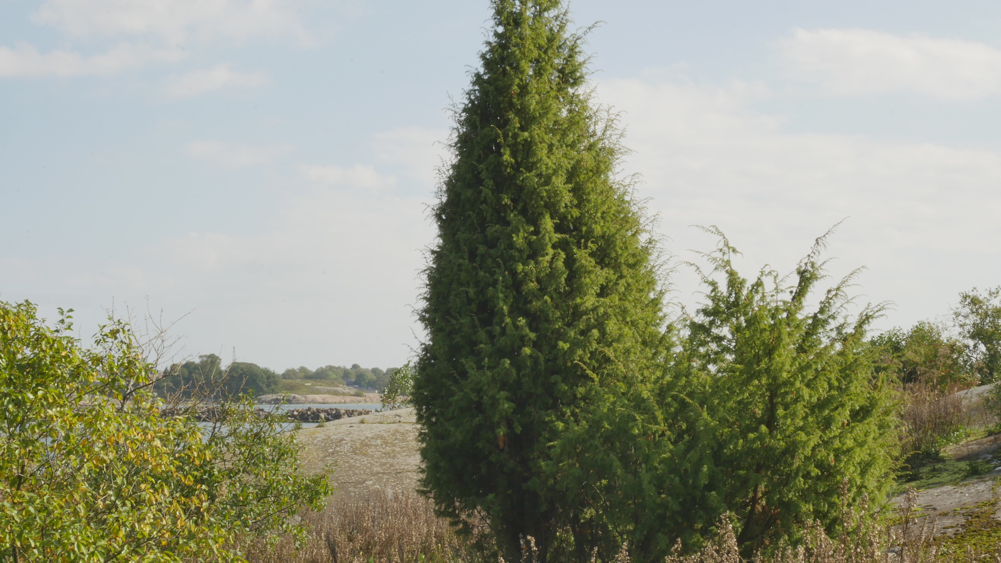 Hello, juniper. I'm trying to position myself in shelter from the wind, but that's easier said than done. Maybe this way, if I push my head in among your needles, we can shelter together, because now the wind is coming from the east, so it's blowing towards you. Nice to see you. Today is September 10, and it's a real Indian summer, warm and sunny, and apparently it will last for a couple more days. I'm coming here for a quick visit to see you because I'm supervising the exhibition, and we finally got it open, all the different parts. There are works in all three casemates and the telegraph office, and then on different floors of the main building. This is the third Artists' Island exhibition, which has an external professional curator and features almost all the island's artists. And it's now a tradition that every other year there's a bigger exhibition like this; this is the third one. And this will be my last exhibition here. I just remembered that there have always been joint exhibitions before, with a wide variety of themes. I remember that sometime in 2003 or thereabouts, there was a big exhibition called Reviiri (Territory), which was done as an art trail. It was mainly here in these surroundings. That was the first time I had talking trees here on the island, five trees that spoke with my voice. You could listen to them talking through headphones that hung from the branches. And there was a CD player with a recording hidden somewhere in the branches or at the base of the tree. But since then, there have been many others, and of course there were exhibitions already in the 90s, I remember participating in them. But the themes have varied, one was a seascape - surprise, surprise, on Harakka Island - and the Energy of Harakka. Then there was Matter and Harakka, which was quite recently, and I think Harakka's memory, which was also some kind of 30th anniversary celebration or something like that. Yes, I have participated in almost all of them in some way, in addition to private exhibitions. Now, for the first time, I have a projection in the hallway of the Art House, down in the basement, and it is a work that I actually made for this exhibition, even though its parts had been made earlier. In the spring of 2024, I visited again the pine tree growing on the west coast, in whose shade I had performed once a week throughout the year of the dog 2006–2007. So now the wind picked up badly [so I repeat that] I had performed in the shadow of the pine tree growing on the west coast during the year of the dog 2006–2007, lying on the rock in different directions and photographing it from two different angles. And I returned to this pine tree, not now in the spring of 2025, but in the spring of 2024. And for this exhibition, I combined these two works, creating a work called Shadow of a Pine – Remix. Well, enough about that, why should I speak about my own work and why would that interest you, but the idea that works are spread around the island is of course interesting. So, if I had wanted to, I could have talked the curator into letting me do some kind of performance with you, even though you’re basically growing on the protected side of the nature reserve boundary. In other words, it wouldn't be a good idea to ask people to cross that rope, as I do once a month as an exception. Yesterday there was a grand opening here. In the courtyard, everyone enjoyed the good weather, punch, and sponsored drinks, and then there was the Olento orchestra, the three-woman Olento orchestra playing, and the atmosphere was electric. Well, not exactly, because we were outdoors, but the atmosphere was cheerful and peaceful, and of course there was a lot of older people in the audience, but also a lot of small children. I didn't have any friends or relatives here, as I hadn't really invited anyone privately except my brother and his wife, and they couldn't make it this time, as they had just been at my private exhibition at the Telegraph gallery a couple of weeks ago. But it was still nice to see old friends, especially Riitta Aalto, who was here for a long time, even lived here, and was also the curator of the Jangva Gallery, where I had a couple of exhibitions many years ago. And then, of course, Marianna Kajantie, who has been retired for a long time now, but who was the city's cultural director, or whatever the title was, and who came up with the whole idea that artists should come to Harakka. And she has supported the artists on Harakka all these years. It was nice to see her again and to see that she is in good health. It's exciting to see this big change happening, with everyone who's been here for over 10 years leaving and new people coming in to replace them. We'll have to wait and see what happens. Of course, there have always been changes in the people here, but there are a few who have been here from the beginning, and it feels crazy to think about what will happen if all the memories disappear. But people do carry memories with them, even after a few years. Well, I won't ramble on with you anymore, partly because this wind is quite unbearable, but also because I stupidly forgot to charge my camera battery and I'm afraid it will run out in the middle of everything. But thank you for letting me talk to you again, and all the best to you for the beginning of autumn. See you again in October. Take care.