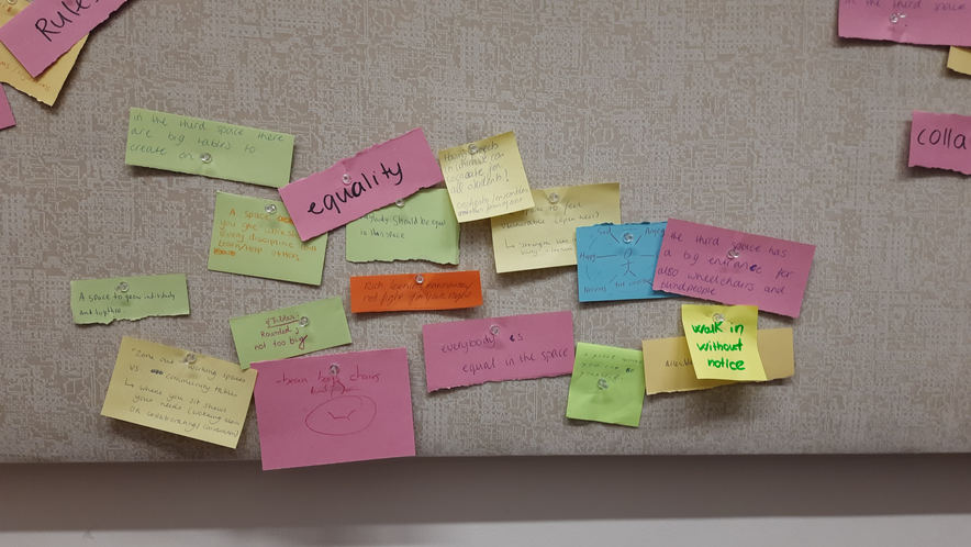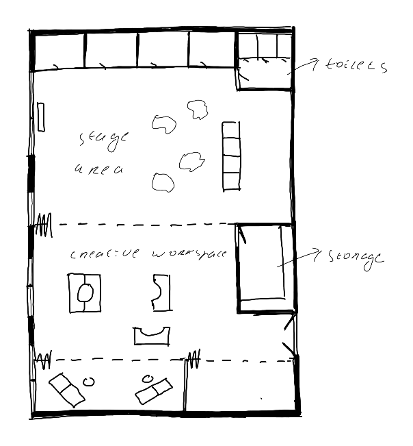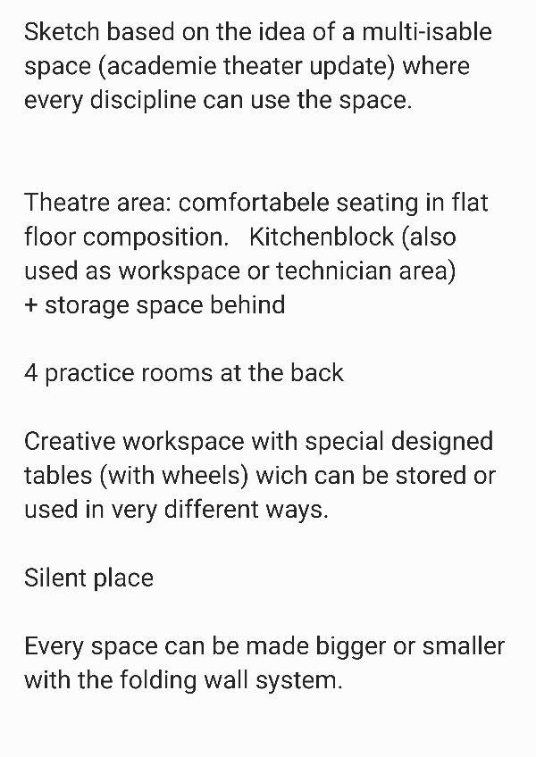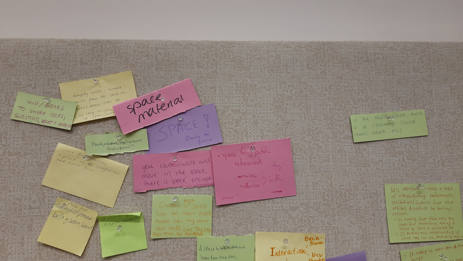 Create a save space like an ‘open studio’. It is a space where people can try their new material. This is for performers and art creators to show their practice. It would be interesting to show your own practice to other disciplines and get feedback/feedforward from people of other disciplines about how they experience it from there artistically point of view.