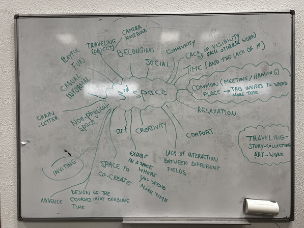While working on an artistic concept for the third space, group number six encountered the reality of the different structures of the different Masters that Fontys University of the Arts offers. We realized that most of us live the physical and social experience of the university once per week, or in other cases for two consecutive weeks every couple of months. Since the concept of third space and place is largely tied to an idea of community, we understand the co-creative act as an effort to form a stronger community within Fontys. As much as we appreciate the effort of including our artistic co-creational understandings of the concept of third space to counsel on the changes that the School is undertaking, we would like to highlight that to form a community time, energy and presence are required. For these things to be present, the very same design of the Masters that Fontys offer would need to be changed. After all, it is very difficult to build relationships that would foster a community seeing each other once per week. We want to leave this as a starting reflection of our creative process.
