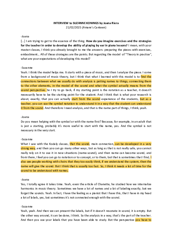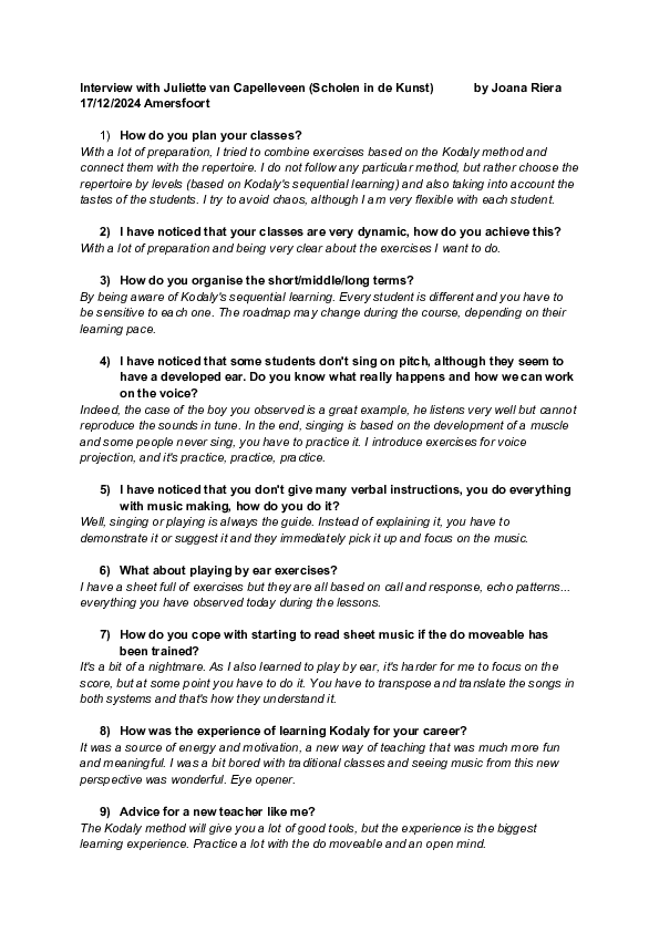 Two interviews with experts in education, especially in the Kodály approach, were formerly conducted, documented, and transcribed. These interviews have been particularly valuable: Suzanne Konings for her expertise in both music theory and the Kodály approach, and Juliette van Capelleveen for her practical application of Kodály’s core principles in piano teaching.