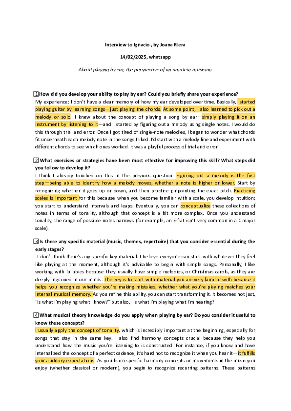 Two additional interviews were conducted, this time from the learner’s perspective. The first was with Daniel Sueiro, a skilled jazz pianist who has developed his aural abilities through years of dedicated practice. The second was with an amateur musician—professionally a physicist—who has impressively cultivated relative pitch through self-guided learning. When in-person interviews weren’t possible, responses were provided via audio or written message. I prepared the same set of questions to each interviewee: