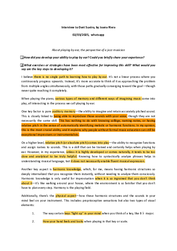 The interview with Dani Sueiro offers a rich, non-linear perspective on learning to play by ear, rejecting the idea of a single, progressive path. For him, the cornerstone is pure auditory memory—the ability to imagine and retain accurately pitched sounds, which is distinct from naming notes or identifying functions. This capacity, he argues, explains why many great improvisers lack formal training. While names can help, they are often too analytical and slow to be reliable in real-time music-making. Instead, what matters more is deeply internalized harmonic knowledge—structures so familiar they’re recognized instinctively—and the physical connection to the instrument, including proprioception and visual impressions (like imagining certain keys “lighting up” or feeling the shape of a hand in a key). His approach blends ear, mind, and body through exercises like: singing imagined melodies from memory without naming notes, internalizing harmonic structures visually and kinesthetically, improvising within scales or chords, transposing phrases into all keys, and transcribing from recordings. Ultimately, he emphasizes that true improvisation is instinctive, and the path toward it involves slow, long-term cultivation of ear, harmonic intuition, and instrumental fluency—three pillars that gradually merge through consistent, varied practice.