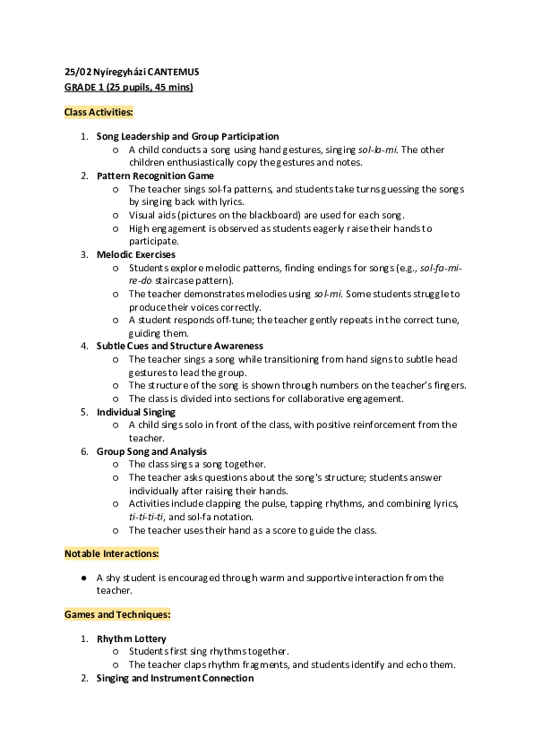 Throughout the observations I carried out alongside my experiment, I was able to gather valuable tools and strategies to enrich my teaching. The Kodály Study Tour, in particular, taught me how to apply core Kodály principles effectively and how to place the voice at the heart of the learning process. Although none of the classes were piano-based, they offered a powerful insight into the role of inner hearing. Even without instruments, embodiment was always present—initial body movements that could later be translated into the more refined gestures required at the piano. Another key takeaway was the strength of group work: how collective musical experiences can enhance focus, motivation, and musicality in ways that individual work sometimes cannot.