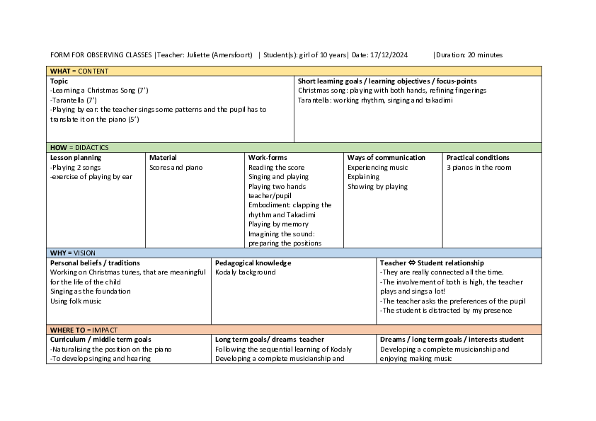 In Amersfoort, I had the opportunity to observe how the principles of the Kodály method are applied in one-on-one piano lessons (as reflected in the earlier interview). These sessions were a vivid example of how Kodály-based teaching can be adapted to the instrument in a personal and engaging way. The lessons were dynamic and flexible, yet carefully structured, with most instructions conveyed through singing and musical interaction rather than spoken explanation. Playing by ear was a central focus, developed through regular use of echo patterns, call-and-response, and imitation exercises.