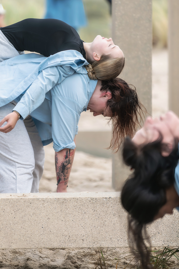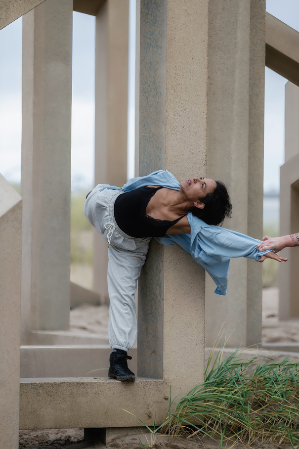 On the day of the performance, we rehearsed at the Zandwacht location, where the dancers transitioned from their role as co-creators to performers. We integrated the structured movements into the site-specific environment and adapted the material to interact with the obstacles and the unique spatial dynamics of the location. Without music, the use of breath became even more important, serving the emotional depth of the theme of resistance and feeling stuck in patterns. Also dancing on the sand on the surface gave opportunities for groundedness, while the total construction of de Zandwacht provided additional possibilities. I had worked out the score on paper, which provided a solid structure and enabled me to take on a decisive leadership role, which was essential, given the limited time available before the audience arrived. This final rehearsal focused on refining the raw yet cohesive performance, emphasizing the dancers' alignment with the site-specific environment. Movements and transitions were adapted to interact with the spatial dynamics and obstacles of the Zandwacht, such as the uneven sand surface and architectural structures. These adjustments brought all the creative elements together into a compelling and grounded 20-minute presentation.