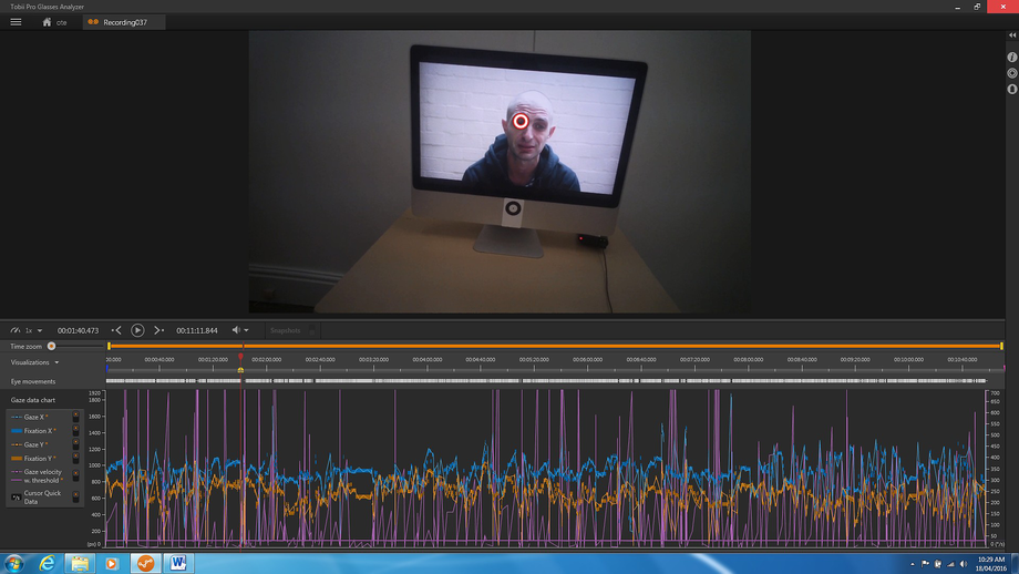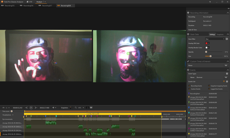 But authenticity is hardly the point. The audiovisual documents that resulted from the re-enactment are qualitatively different from those that would have resulted from using a wearable camera. A wearable camera only shows the general direction of a wearer’s head, while data-rich eye-tracking systems show what the wearer is actually attending to. The fact that the Tobii Pro Glasses 2 system is not something that one can use at home leads to different viewing behaviour and different representations of viewing behaviour. Further, eye-tracking glasses are also different from their cousin-technology, desktop eye tracking, in which the software both presents the image and tracks the eyes. As such, there is a direct connection between the image on the screen and the location of the eyes. But eye-tracking glasses record the location of the eyes relative to the glasses themselves while also recording the field of view from a scene camera on the front of the device. The glasses are, in a sense, unaware of what the wearer is looking at.