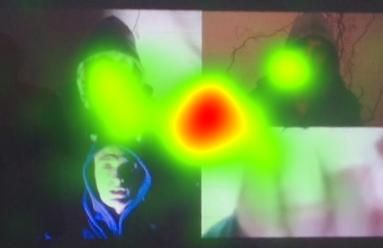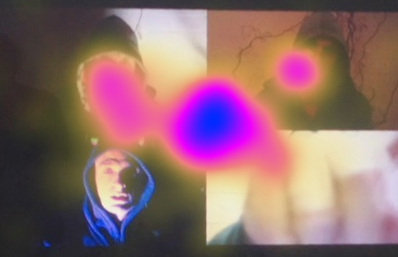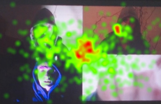 The live art installation of OTE might have instead asked participants to use a wearable camera while watching Telephone in order to capture audiovisual material that felt authentic and immediate. Such a work, however, would not have achieved the impact of OTE’s performance of science, in which we see Svetlana’s authority partly residing in her eye-tracking glasses, a sophisticated technology decidedly not for at home use.[18] OTE employs the superficial power of the appearance of complex technology to achieve its effects, and the complex para/social interactions between participants and Svetlana largely reveal an implicit trust in science and technology as neutral and beneficial. On the other hand, however, OTE aims to reveal the construction of image media and, consequently, subvert the power of eye-tracking technology.