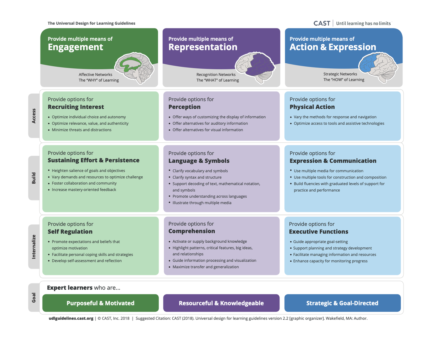 To internalize representation requires understanding . In the UDL, understanding is about understanding and interpreting what is read, heard or seen. Students need to learn the skills on how to turn accessible information into actionable knowledge. In the context of UDL, the following benchmarks are given to offer different ways of understanding: