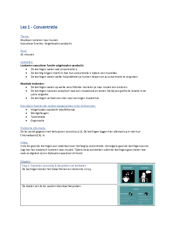 As a result of the informed exploration phase, design criteria were drawn up. Based on these design criteria, a prototype was designed that consists of one lesson in which both the executive function sustained attention and listening to music are worked on. The prototype is based on the UDL principles so that the lesson is inclusive and accessible to all students regardless of their abilities or limitations.