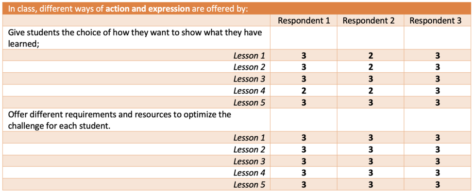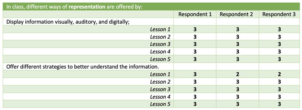 The respondents indicate in their observation that the UDL framework is well met. There are still some tips given by the resonants in various areas: