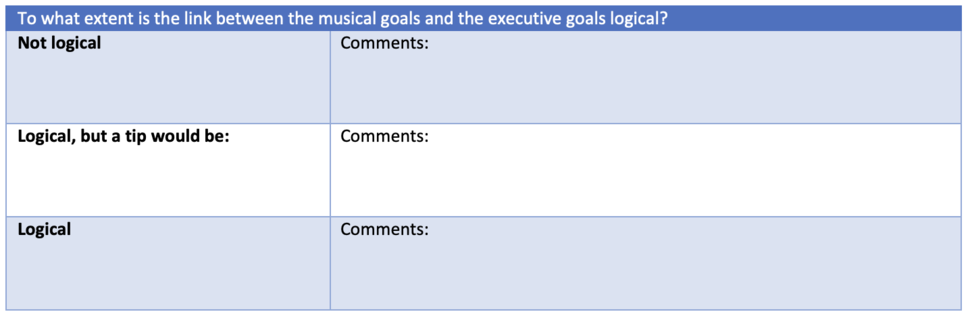 All respondents indicate that the link between the musical goals and the goals in the field of executive functions is logically found in class. However, it is indicated that this link is not explicitly explained to the student in all lessons. In addition, the link between the subject of the lesson and the goals is not always explicitly present.