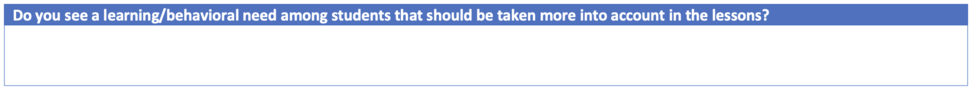 The respondents observe especially at the first lesson what learning / behavior needs that could possibly be taken more into account. In the first lesson, a tip is given to adjust students in a physical way by briefly touching the shoulder. In the second lesson, the tip is given to focus as a teacher mainly on the students who participate motivated. In the third, fourth and fifth lessons, respondents do not observe any learning/behavioral needs that require more attention. The fact that the respondents observe this behavior especially in the first and second lessons could hypotetically also mean that students needed some space to get used to the way the lesson is organized and the topics that are discussed.