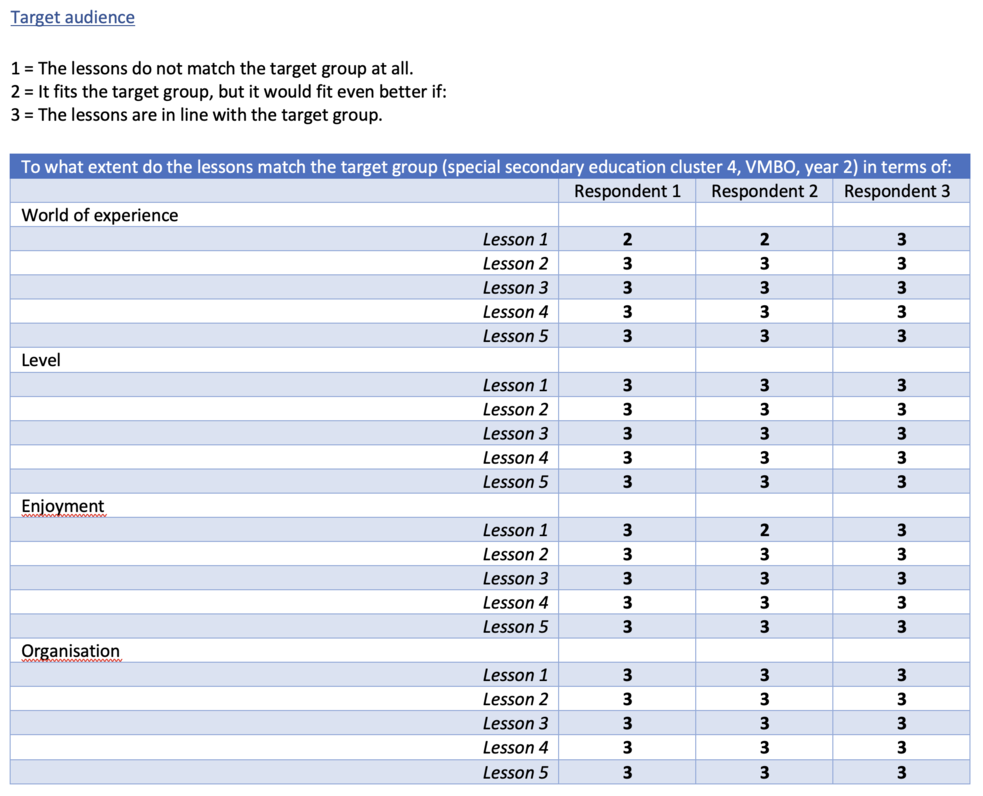 The respondents all observe that the lessons fit well with the target group in terms of experience, level, enjoyment and organization. It is still given as a tip that when listening to music, more different genres of music could be covered to ensure that all students feel involved in the lesson.