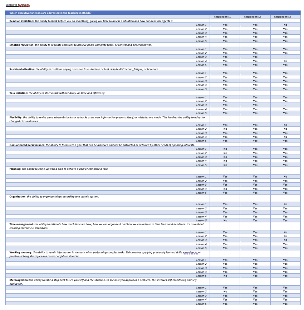 Almost all respondents observed that all executive functions are offered in the working methods. Only respondent one indicates that no goal-oriented behavior was worked on in the lessons. However, it is mentioned that this is often done in an implicit way and not in an explicit way.
